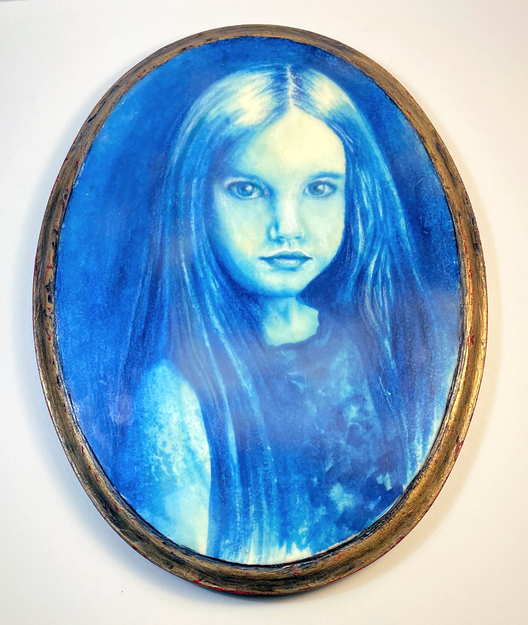 "Veiled in Blue" reveals a serene world through a watercolor portrait of a young girl, softly draped in dreamy blue tones. The waxy encaustic layer adds a subtle veil, enhancing the nostalgic aura, while the faux antiqued gold leaf frame frames her gaze, inviting contemplation of the timeless beauty veiled in the innocence of youth
