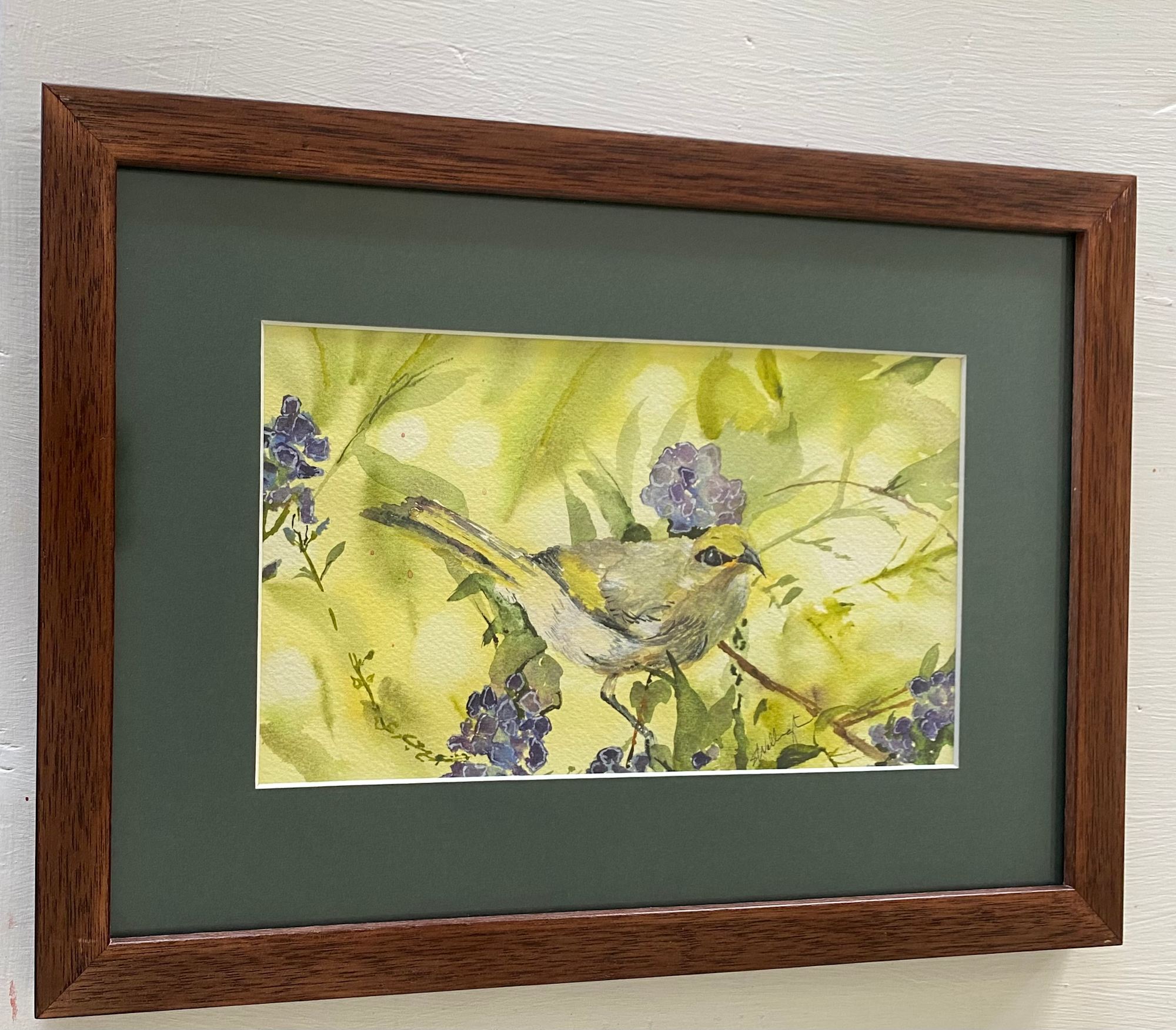 Professionally framed with dark green matting and natural dark timber with non-reflective glass.