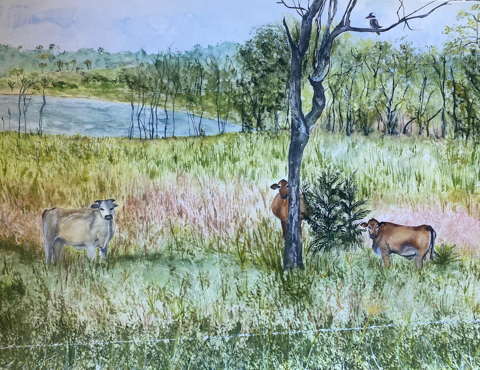 Returning home from a local drive we decided to take the back way. Suddenly I shouted, "Stop the car!" I had to take a photograph of this scene so that I could paint it. There was a group of cows in a lovely landscape and one seemed to be hiding behind a tree, not wanting to be seen, let alone have its picture taken. It was only when we got home and looked at my photograph that we noticed the kookaburra in the tree watching from above. It made the scene even more special.
