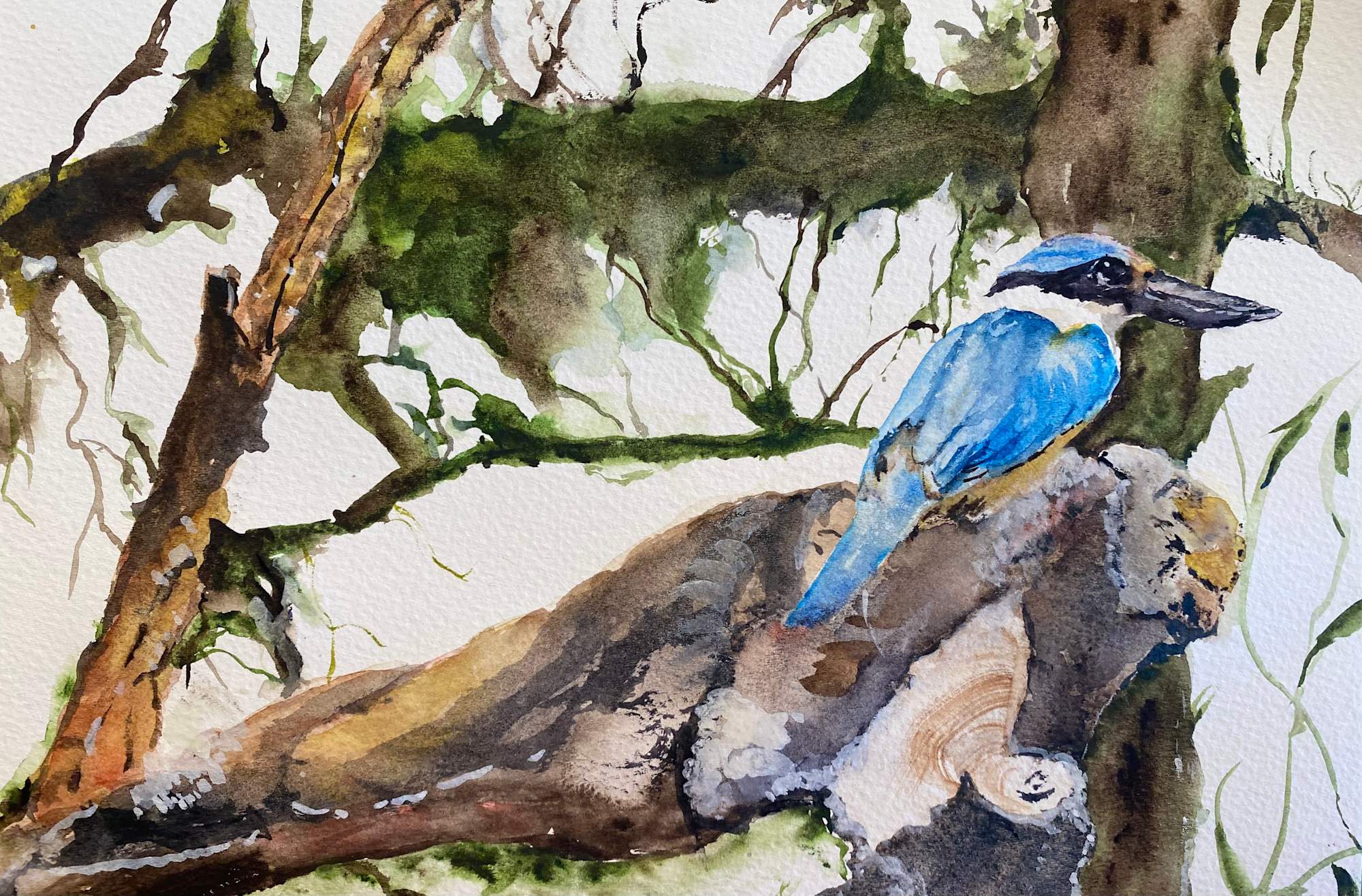 This little painting was inspired by my love of kingfishers. I am grateful to Mary Martin for her reference photograph.