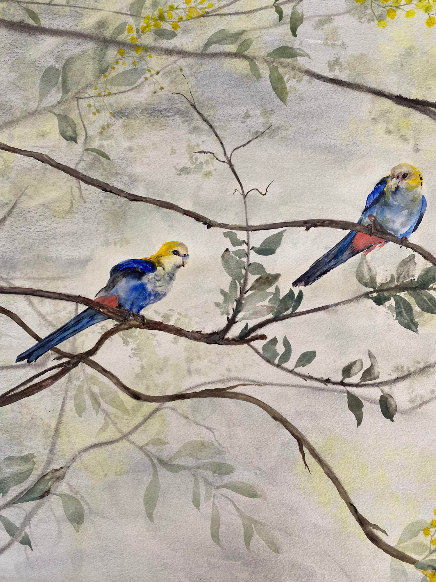 This painting is a homage to the magical pale headed rosellas often seen on our property. They are resting in our much-loved wattle tree. Every time we catch a glimpse of them, there are always two, a shared journey. It is a reminder of the importance of companionship in this separate experience of life.