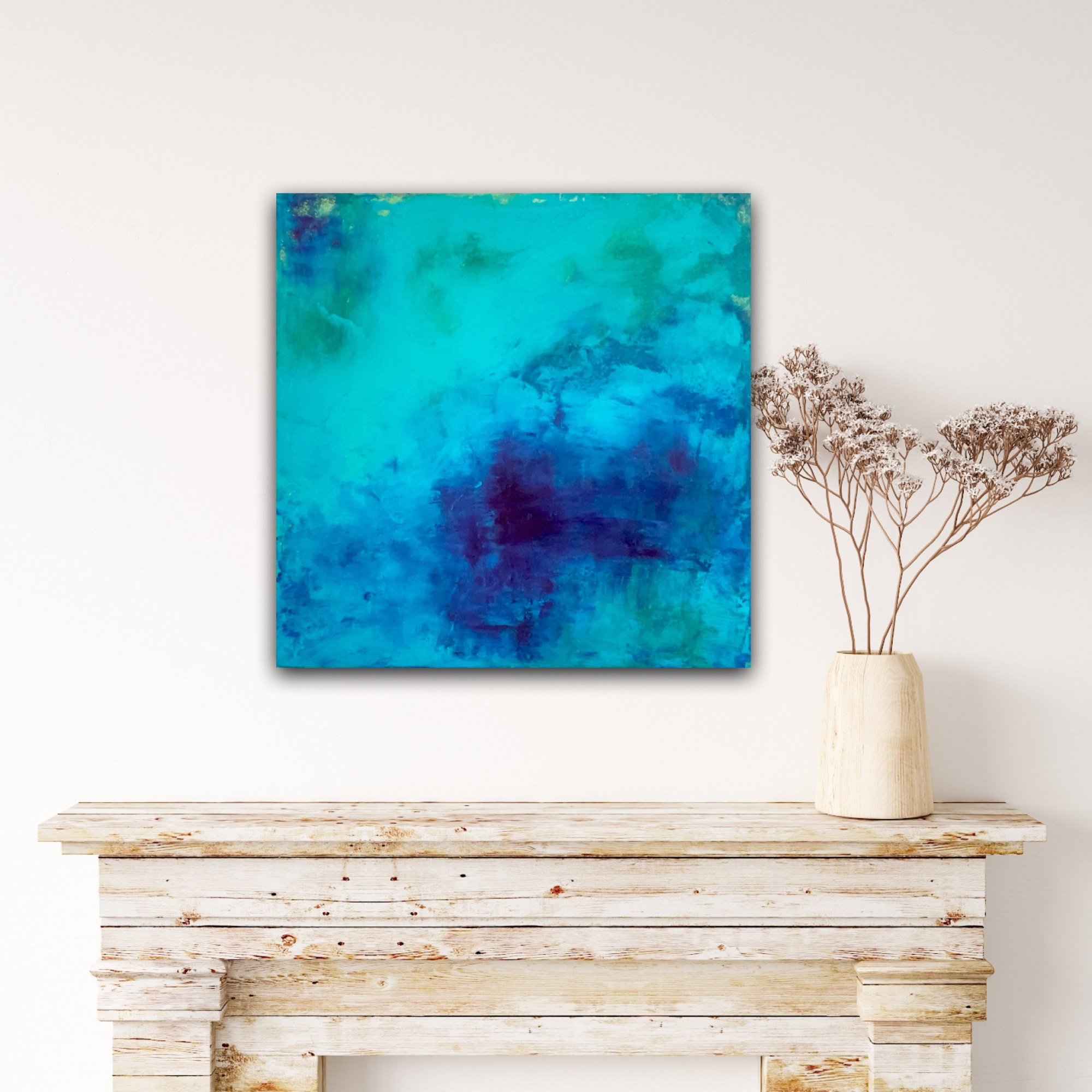 This piece is really about the exquisite quiet of being underwater. This is one of my process driven pieces. Making "process driven" art means participating with some materials without a fixed idea of the final outcome and where the process is a key part of the practice. It's a spontaneous collaboration between materials, physics, my hands and my brain. It involves sort of relaxing my conscious mind and accessing my intuitive subconscious. Right brain, left brain. It is a fascinating exercise and an important part of my art practice and my life practice. This piece almost glows with super saturated color. For this piece I made my own paint from dry pigments and acrylic binders.