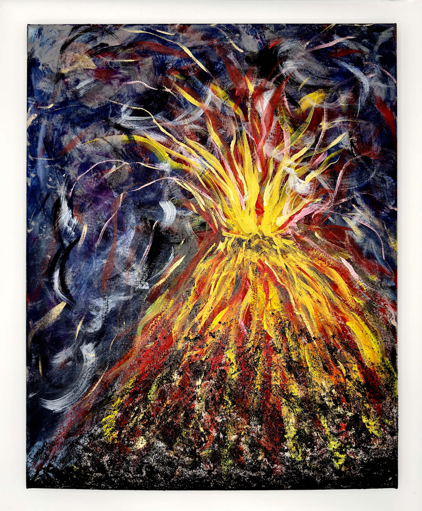 A powerful eruption captured in vivid texture and motion, this painting portrays a volcano unleashing streams of molten yellow, orange, and red into a swirling, turbulent sky. Bold strokes and layered color bring the fiery explosion to life, contrasting against deep blues and purples that twist and churn like storm clouds or billowing smoke. The dynamic energy and raw force of nature dominate the scene, drawing viewers into the primal spectacle of earth’s molten heart breaking free.