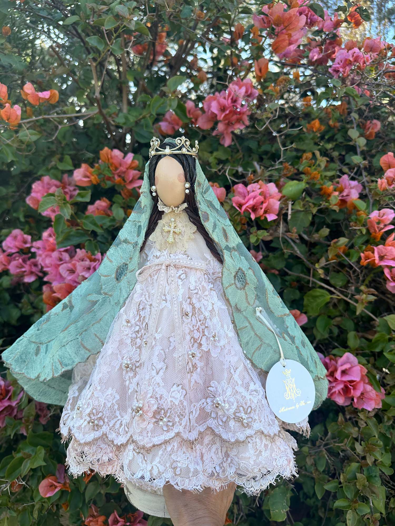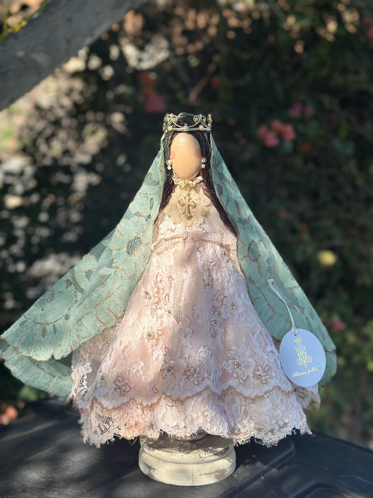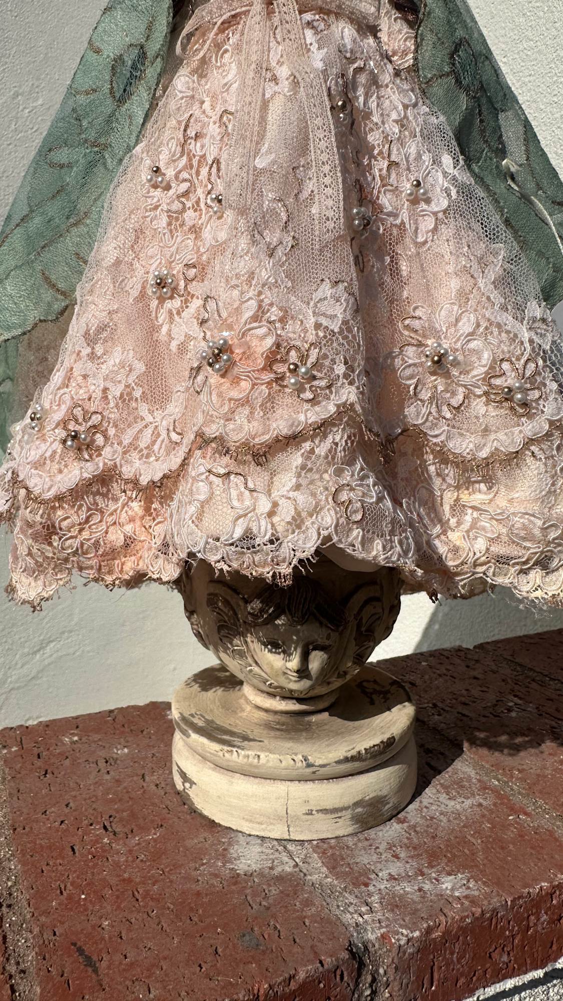 This Madonna is enveloped in an antique Spanish mantilla layered over delicate French lace. She is adorned with a metal rosary, symbolizing enduring faith and devotion. The dress is composed of hand-dyed Alençon lace, meticulously crafted to embody both beauty and heritage. The Madonna is presented over a carved wooden cherub base, adding a touch of celestial grace to the display.