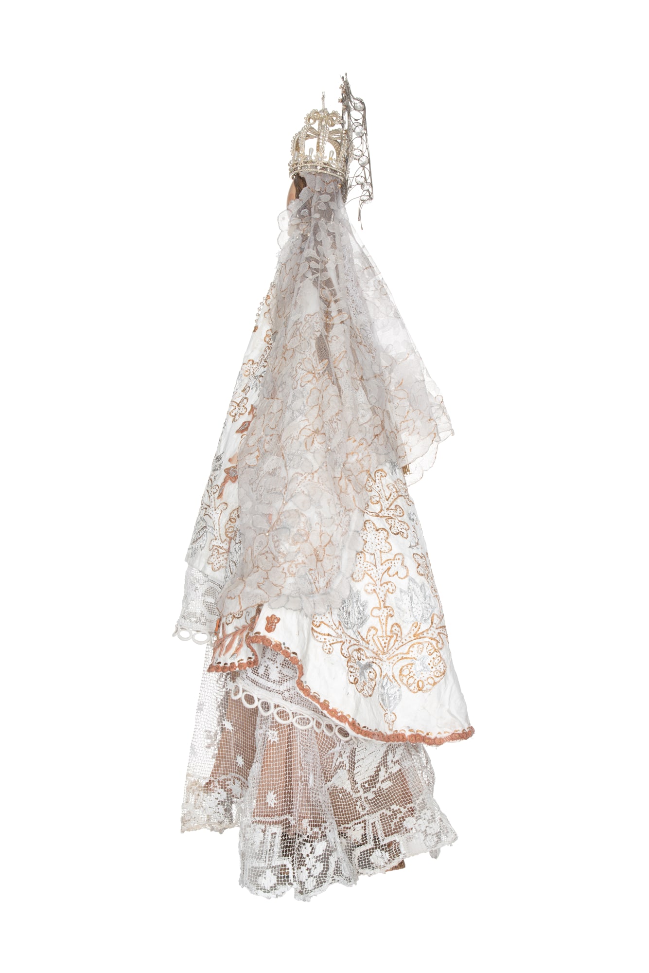 Resplandor de filigrana plateado con zirconias cúbicas incrustadas. Corona de oro con perlas y zirconias cúbicas. Mantilla española pintada a mano con oro líquido y con cristales incrustados. Cuello de encaje de crochet guipur francés. Antiguo vestido de novias, francés, con bordados de pájaros y naturaleza, pintado con oro y plata líquida y con el bordado del nombre de la pieza, la fecha y los nombres de los dueños. Falda francesa con encaje antiguo de algodón en forma de red y bajo fondo de chiffon de seda de color naranja teñida a mano. Pedestal de madera.