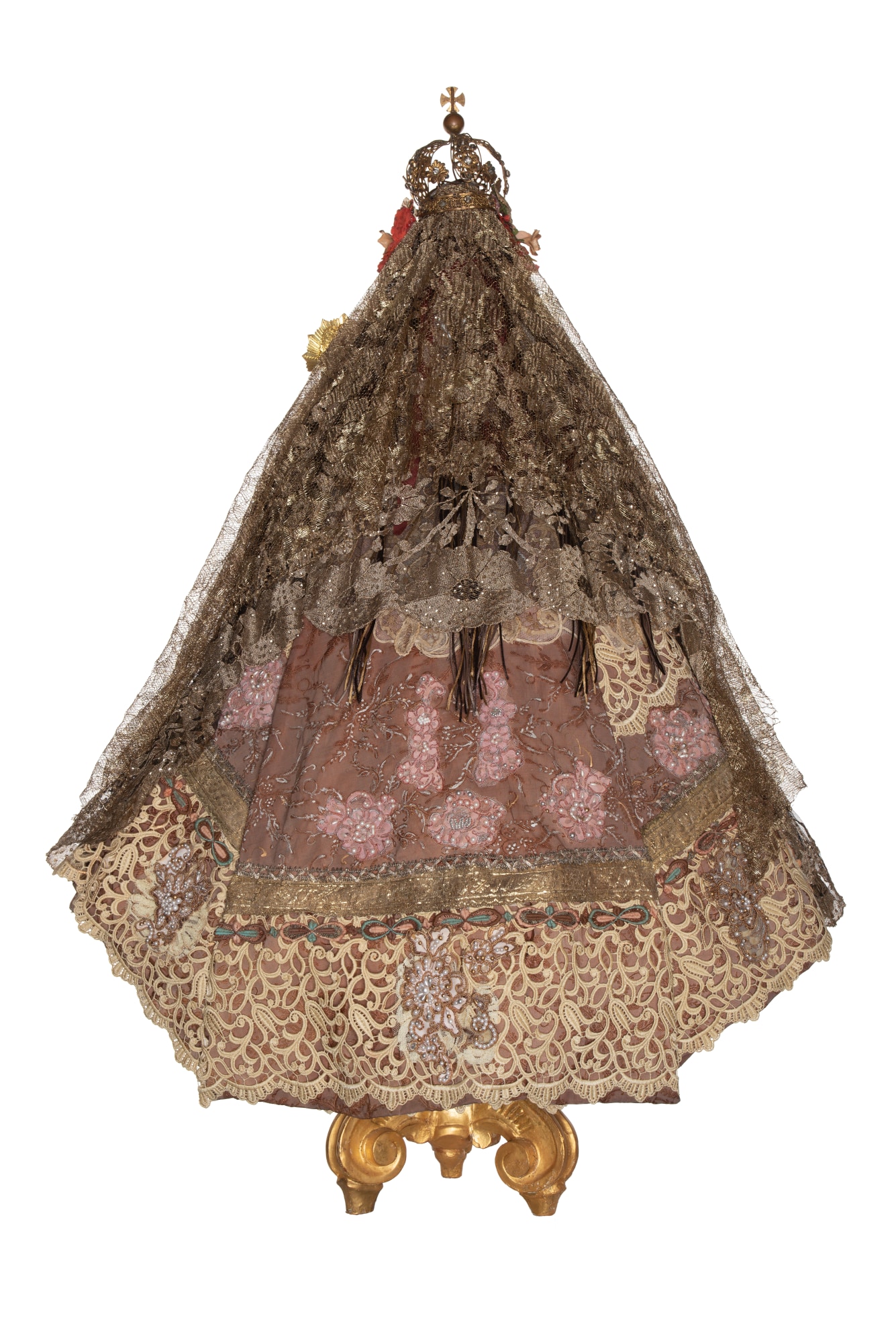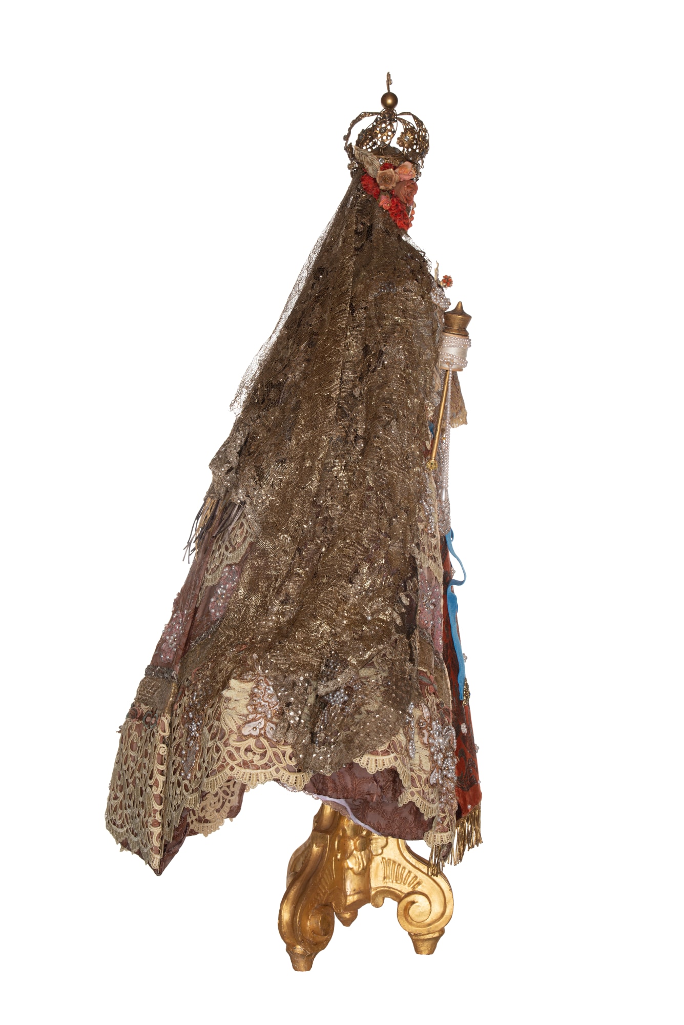 Gold plated Peruvian halo with mirrors. 19th-century gilt repoussé crown with encrusted crystals, pinnacle orb, crucifix, inlaid vintage crumb flower decorations, and vintage velvet leaves. Gold plated Oaxaca crucifix of filigree and sweet water pearl necklace. Oaxaca pearl earrings. Hand-made antique Edwardian Battenberg lace collar hand-painted with silver and liquid gold. Inferior veil of vintage Spanish mantilla circa 1950. Superior veil of golden lace circa nineteenth hundreds. Cape made with contemporary laces circa 2000, inlaid french embroidery with pearls, hand-painted with liquid gold, and antique 1900s gold galloon. Italian Fortuny velvet dress. Antique wooden gold-gilded stand.