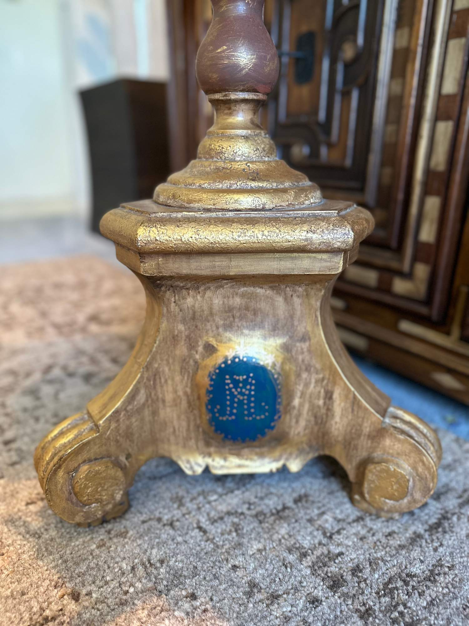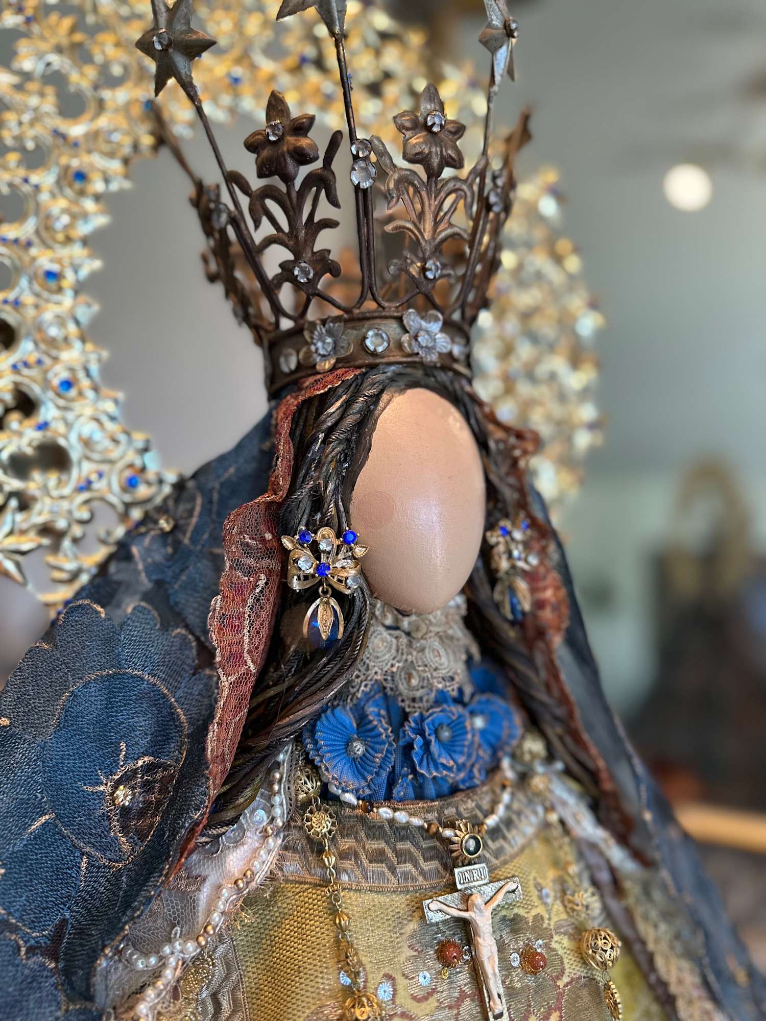 This Madonna is a representation of the Virgen de la Defensa, patron virgin of Jalisco. Among the materials that compose the sculpture, the Madonna is covered in a draped traditional Spanish mantilla. She is graced with a crown from New Mexico adorned with Swarovski crystals and with a Mexican brass halo, also embellished with Swarovski crystals. Beneath her guimpe lies an antique imitation ivory crucifix, a hidden symbol of faith. The Madonna wears intricate Mexican filigree earrings, and her waist is cinched with a unique belt crafted from Susana’s vintage book link bracelet featuring multicolored cabochon stones. This belt is harmoniously paired with a religious stole and an antique filigree necklace, creating a blend of personal history and sacred symbolism. Her dress is a stunning antique religious chasuble, meticulously embroidered with goldstone, and complemented by a cape lined with satin-finished cotton from another antique chasuble. The ensemble is further enhanced with Alençon lace, pearl embroidery, and metallic flower appliques from the 1920s. Susana Ramos expertly weaves together diverse elements of different time periods crafting family relics that evoke a long tradition of family devotion.