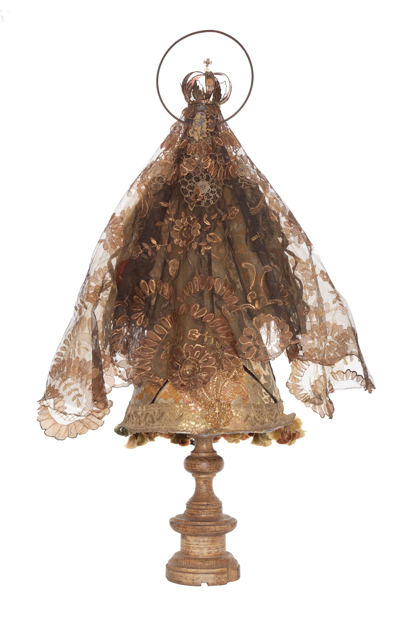 Growing up in Mexico, one of the most devout Christian countries globally, Susana Ramos creates sculptures of the Virgin with sacred repurposed artifacts. Through her faith and the many titles and versions of the Madonna, Honold Ramos recreates the many faces of the Virgin every day. In her studio, she stores thousands of modern, antique, and ancient textiles from around the world and with stones and crowns she creates relics worthy of being a channel of prayers and good intentions.