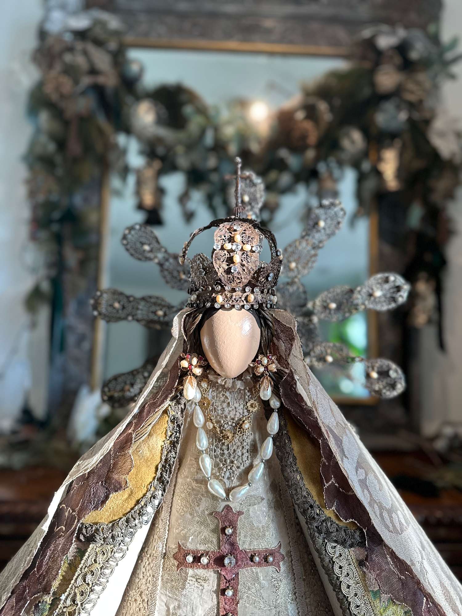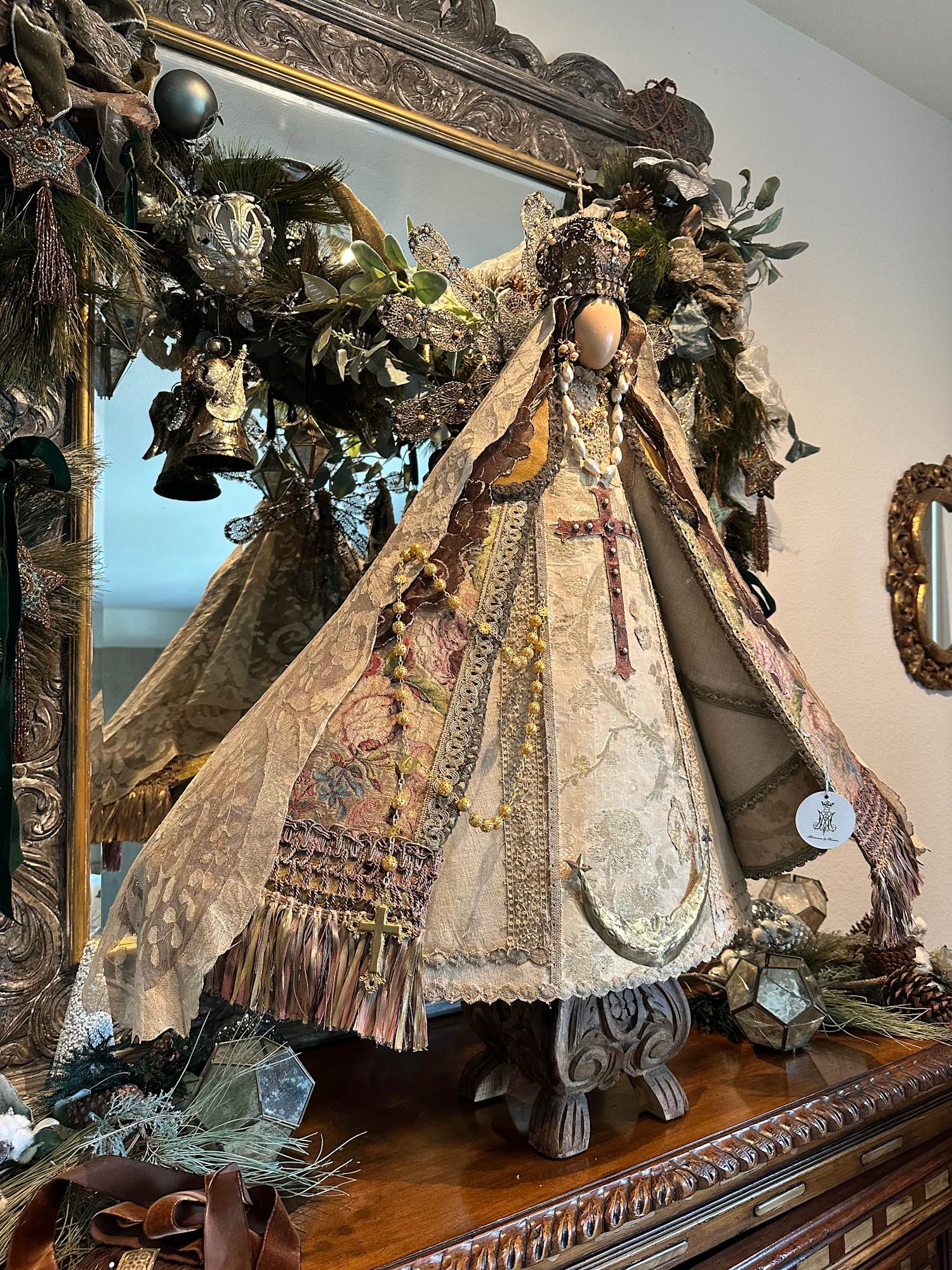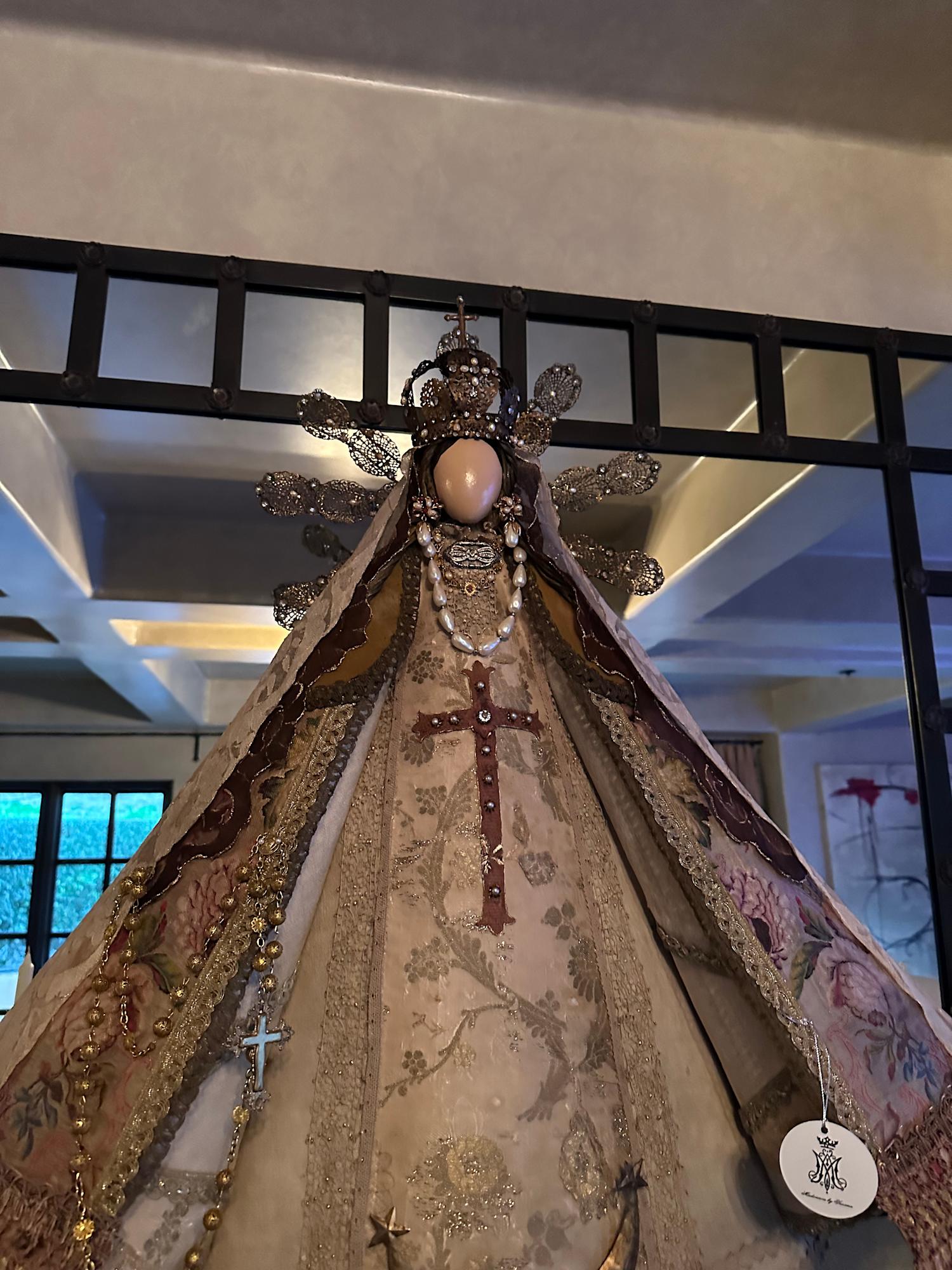 Among the materials that compose the sculpture, both the dress and cape are crafted from an antique French chasuble with floral brocade and a hand-embroidered cross appliqué. The contemporary filigree crown and halo are complemented with baroque pearl earrings of Mexican filigree. The double Spanish mantilla veil is decorated with hand-dyed gold accents, enhancing the ensemble, while the guimpe features lace with appliqué embellishments. All these elements are carefully presented on a carved wooden pedestal.