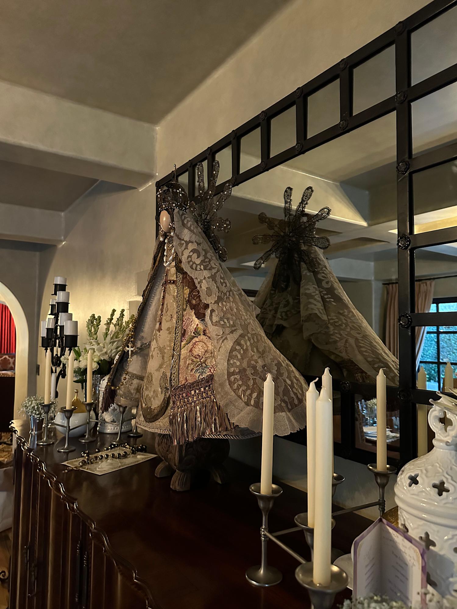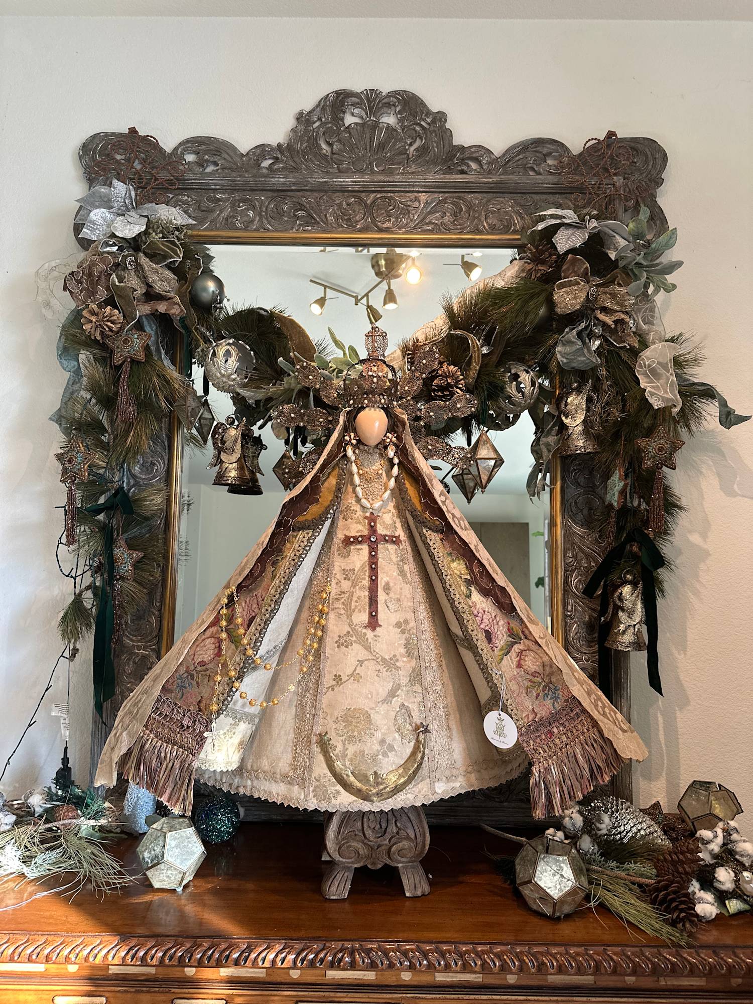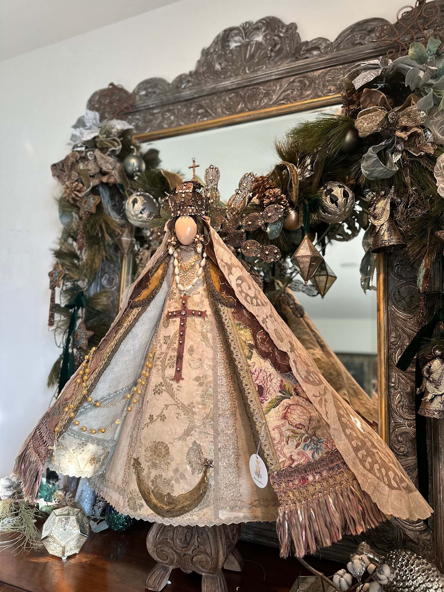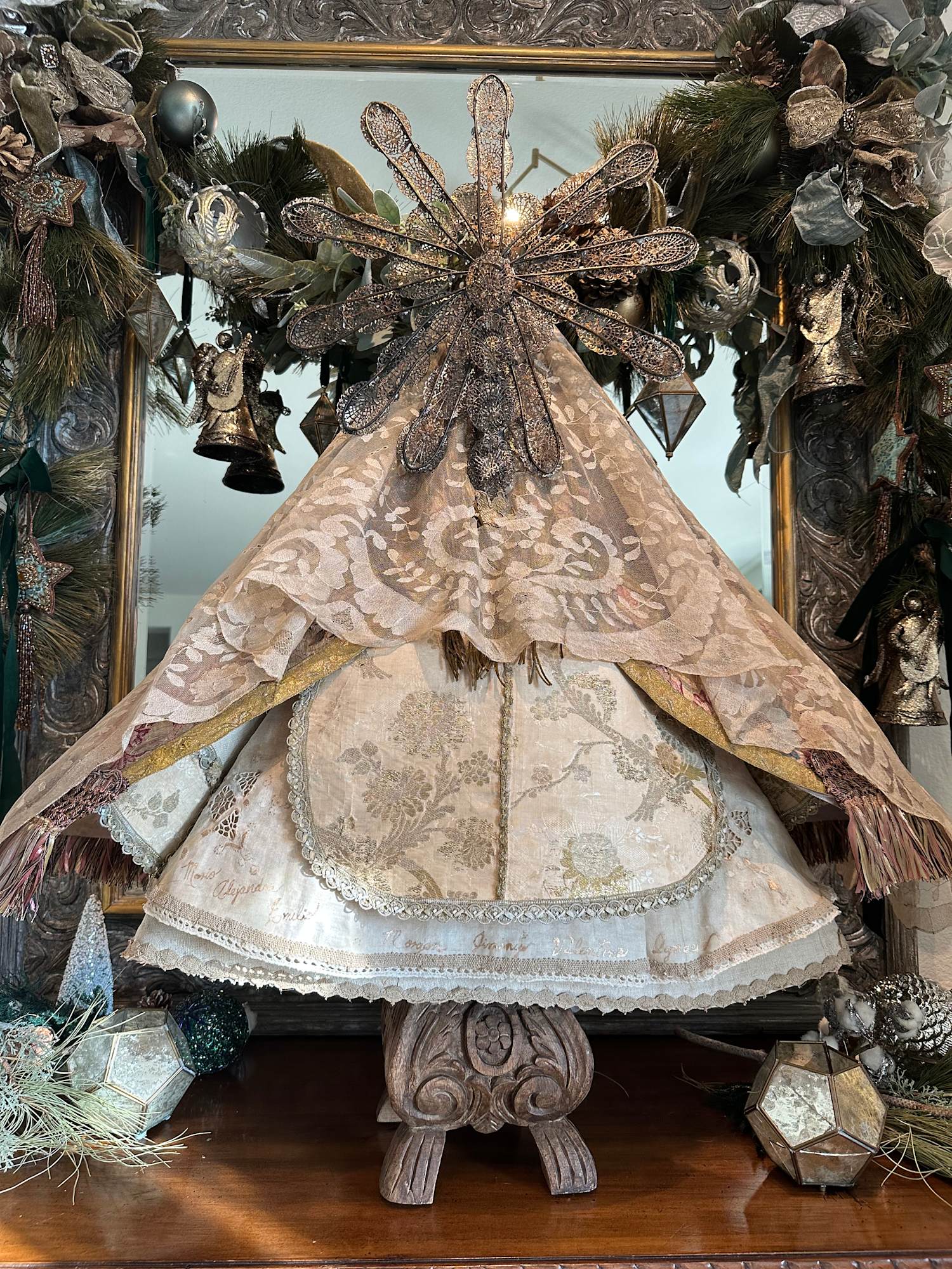 Among the materials that compose the sculpture, both the dress and cape are crafted from an antique French chasuble with floral brocade and a hand-embroidered cross appliqué. The contemporary filigree crown and halo are complemented with baroque pearl earrings of Mexican filigree. The double Spanish mantilla veil is decorated with hand-dyed gold accents, enhancing the ensemble, while the guimpe features lace with appliqué embellishments. All these elements are carefully presented on a carved wooden pedestal.