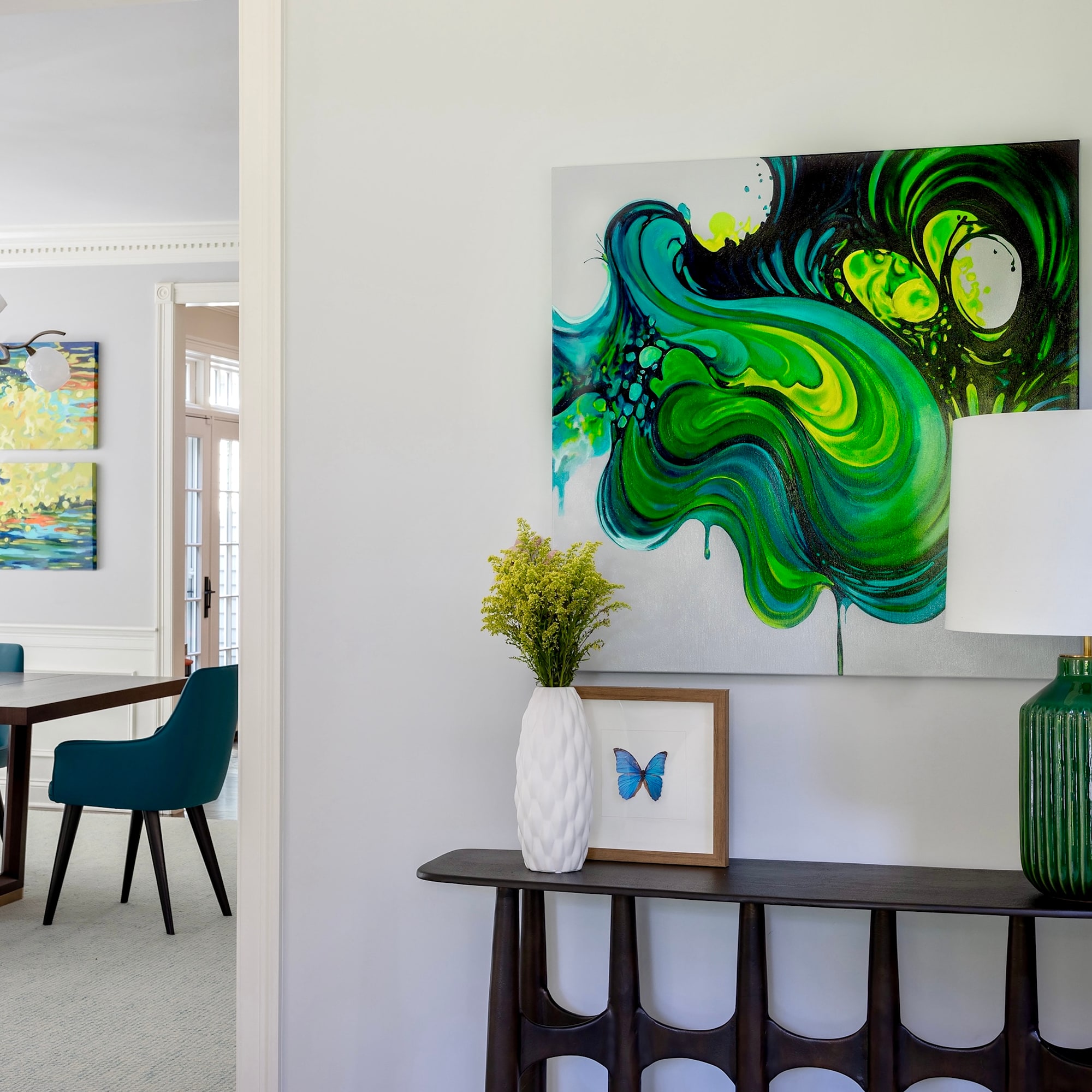 In Cocoon, I explore the delicate balance between transformation and containment through a swirling dance of line, shapes, color, and value. The interplay of vibrant hues converges and diverges, creating a dynamic visual rhythm that evokes a state of becoming taking place. Embedded within the swirling organic shapes are subtle hints of a butterfly’s wing in transition, suggesting the change is both powerful and intimate. The transitions throughout the composition invite the viewers to ponder their own experiences of growth and transformation. "Cocoon" is a meditation on the quiet strength found in moments of transition. It captures the essence of being on the brink of something new, enveloped in a space of potential, and the beauty inherent in our process of becoming. Through this work, I aim to evoke a sense of wonder and reflection, celebrating the infinite possibilities that arise from the embrace of change.