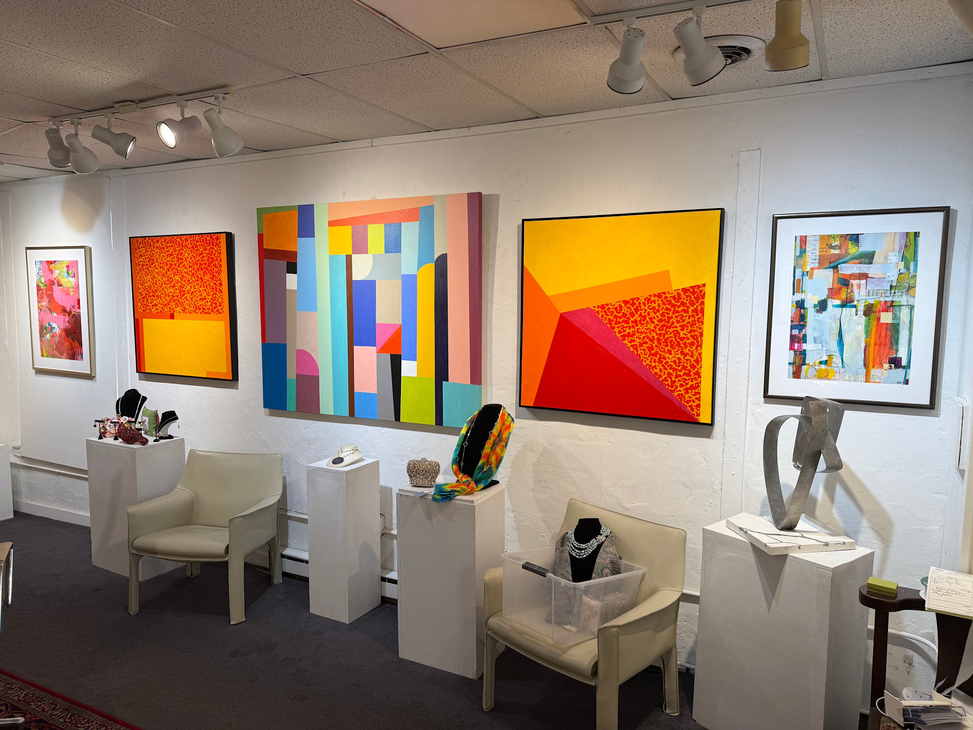 Fireside 1 channels the flickering, unpredictable nature of flame through sharp angular forms. The composition pulses with movement, while a palette of warm tones conveys both the fire’s vitality and its potential for transformation. In contrast, Fireside 2 emphasizes containment and calm. Its structured lines evoke the hearth itself - the architecture that holds and shapes the fire - offering a sense of grounded stability.