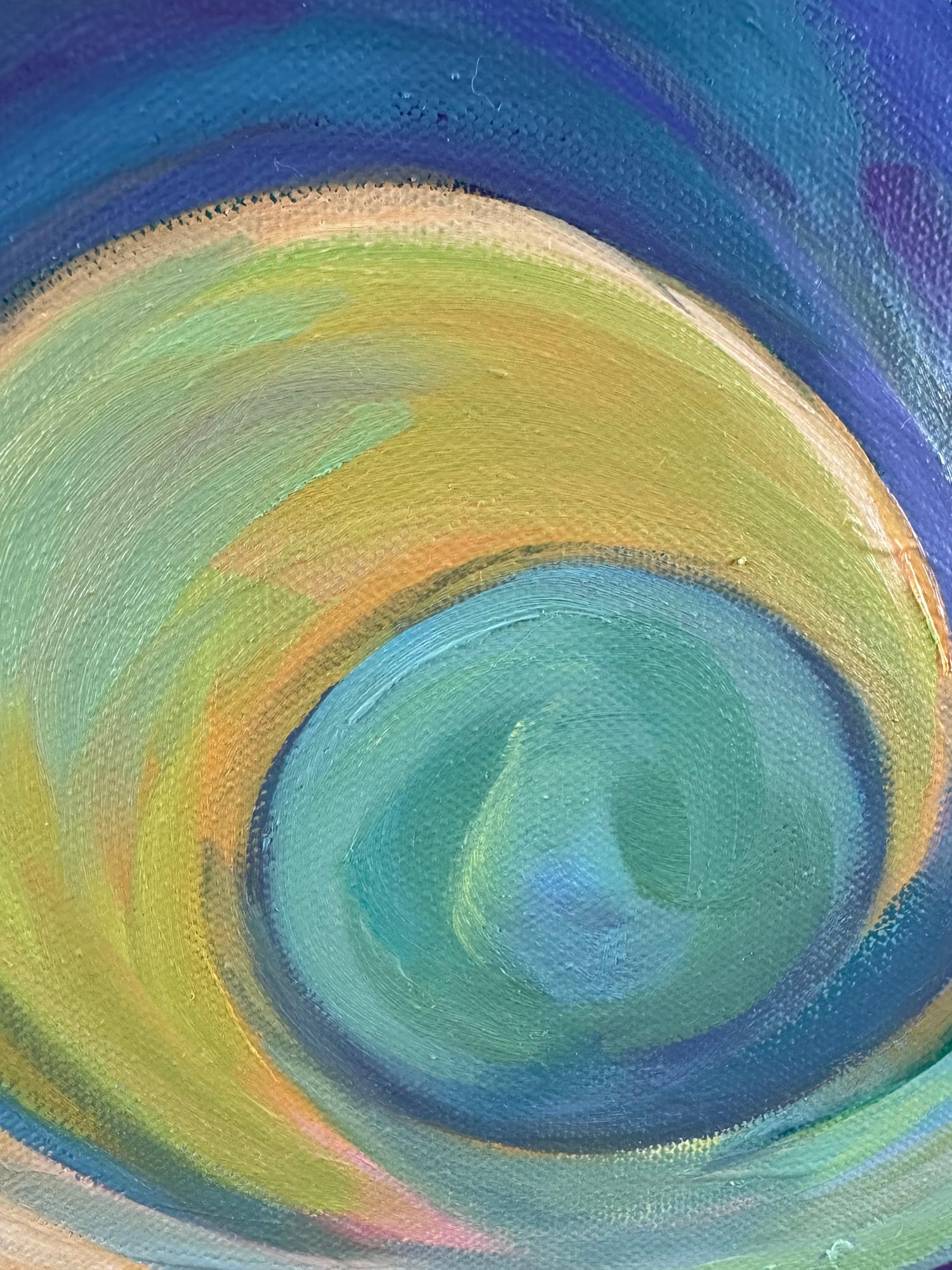 Swirling lines and vibrant hues of pink, lime green, violet, and blue evoke both the stillness of waiting and the urgency of becoming. Below, the seed pulses with quiet determination; above, life bursts forth in radiant expression.