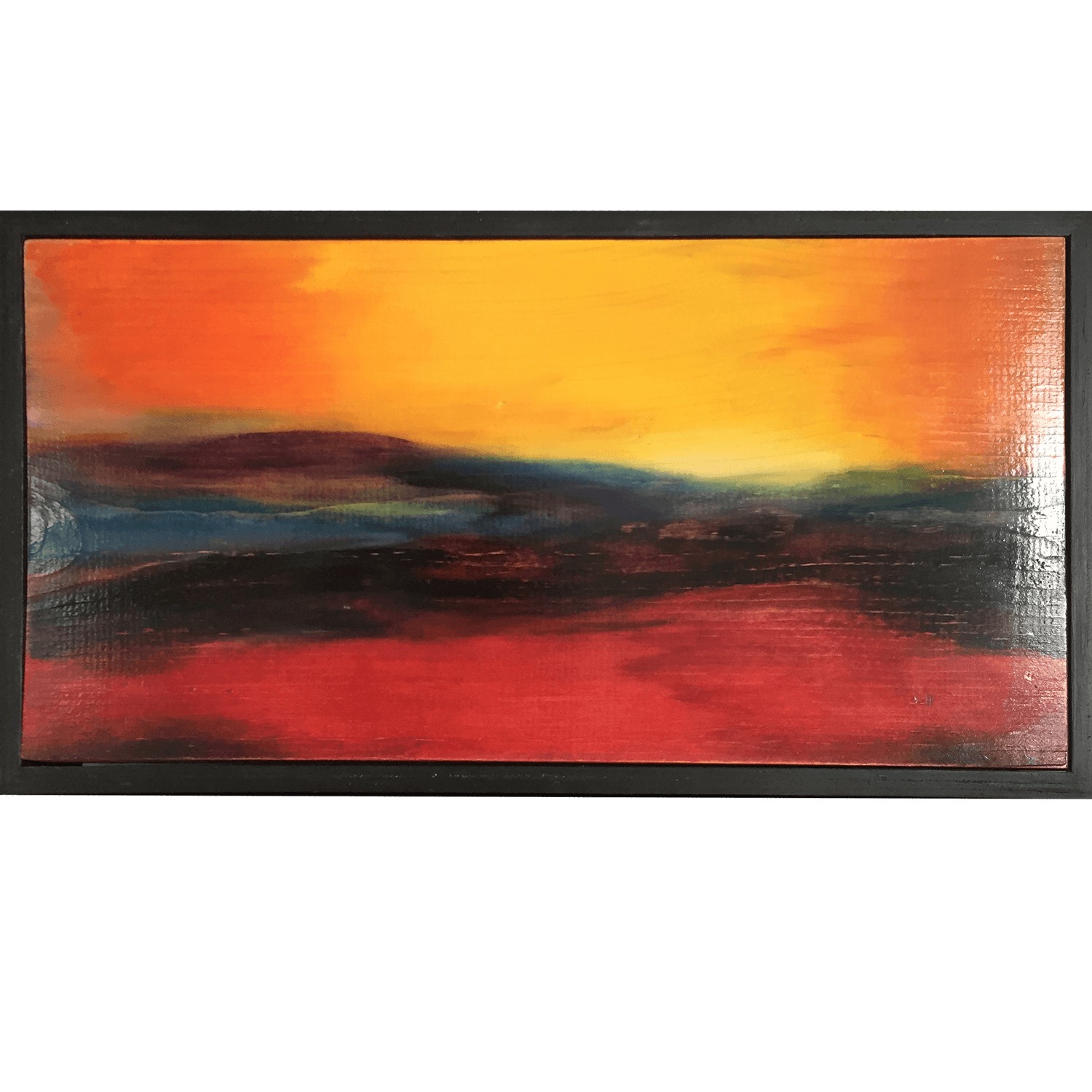 Abstract art on wood inspired by a beautiful sunset and appropriately named "House of the Rising Sun".Bright abstract art on wood has gorgeous sunset colors and can be your perfect place. This piece of wood art is stained with blended colors of orange, red, yellow, and blue and set off by your own imaginary lake or ocean coastline.
