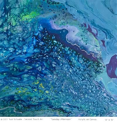Gaze into this piece and just imagine all of the beautiful possibilities of floating through your Tuesday Afternoon. Sway through this beautiful color combination of blues, purples and a slight hint of green and allow yourself to soak it all in.