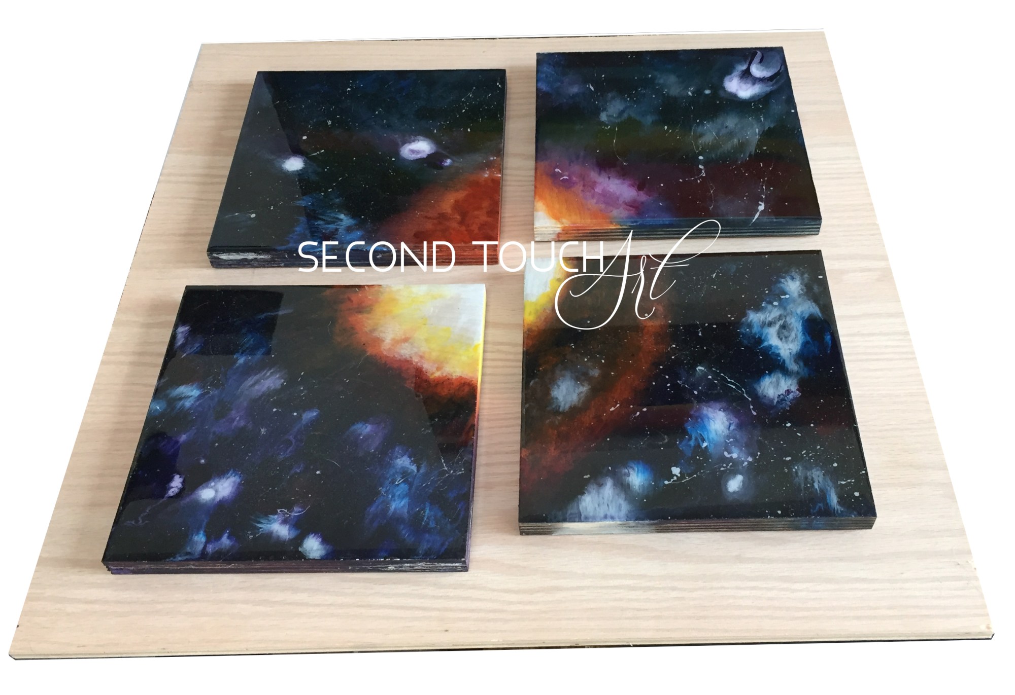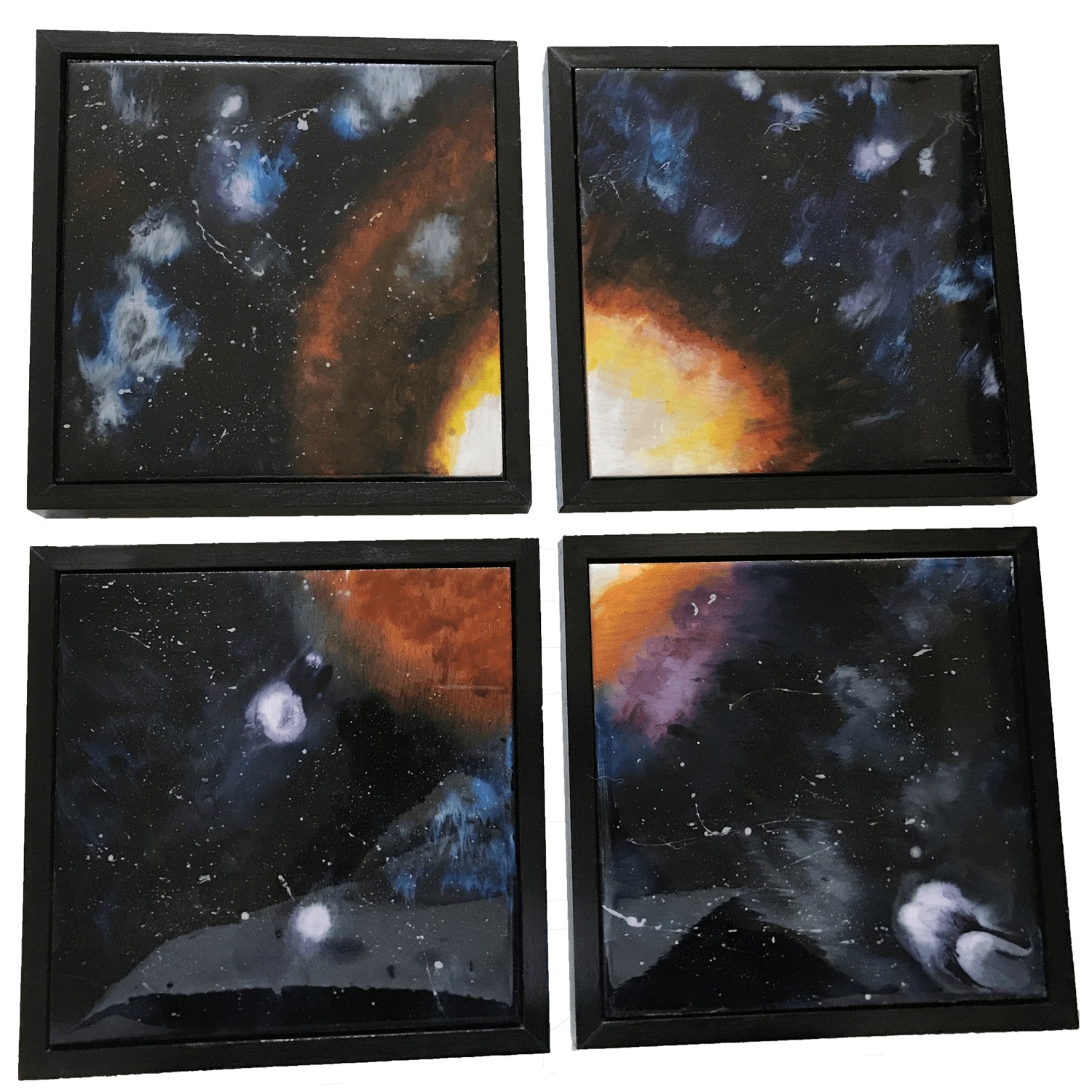 This tetraptych's 4 pieces each measure 10" x 10" framed and are sealed with epoxy resin. Individual custom floating frames complete this set making it ready to hang or display.