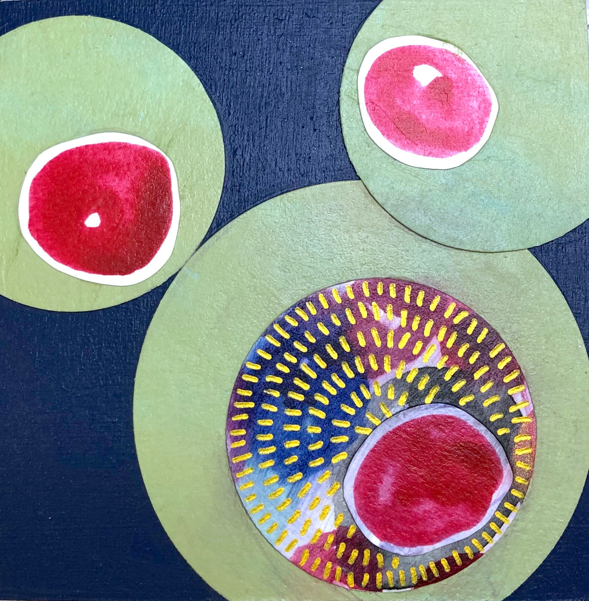 Dots 62, Navy + Moss & Red, mixed media, 4 x 4 inches, ©2022 Suzanne Gibbs
