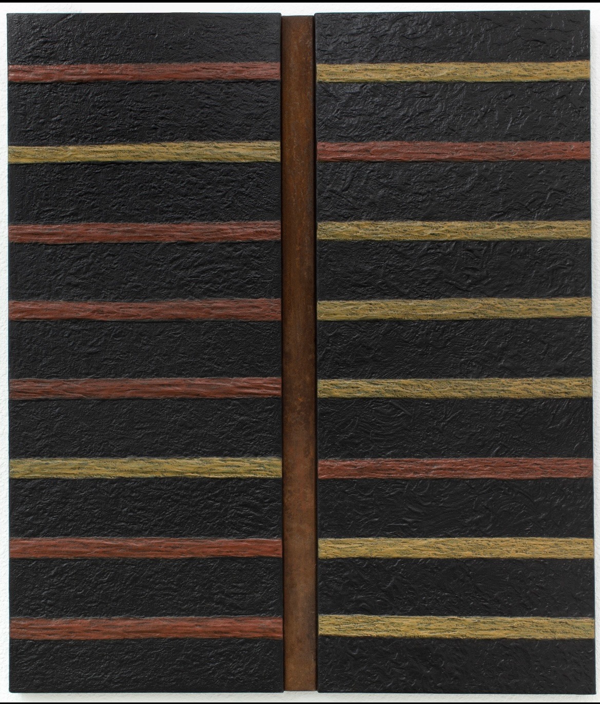 Two colored and acrylic panels with a rusted metal piece running down the center of the piece between the painted panels.
