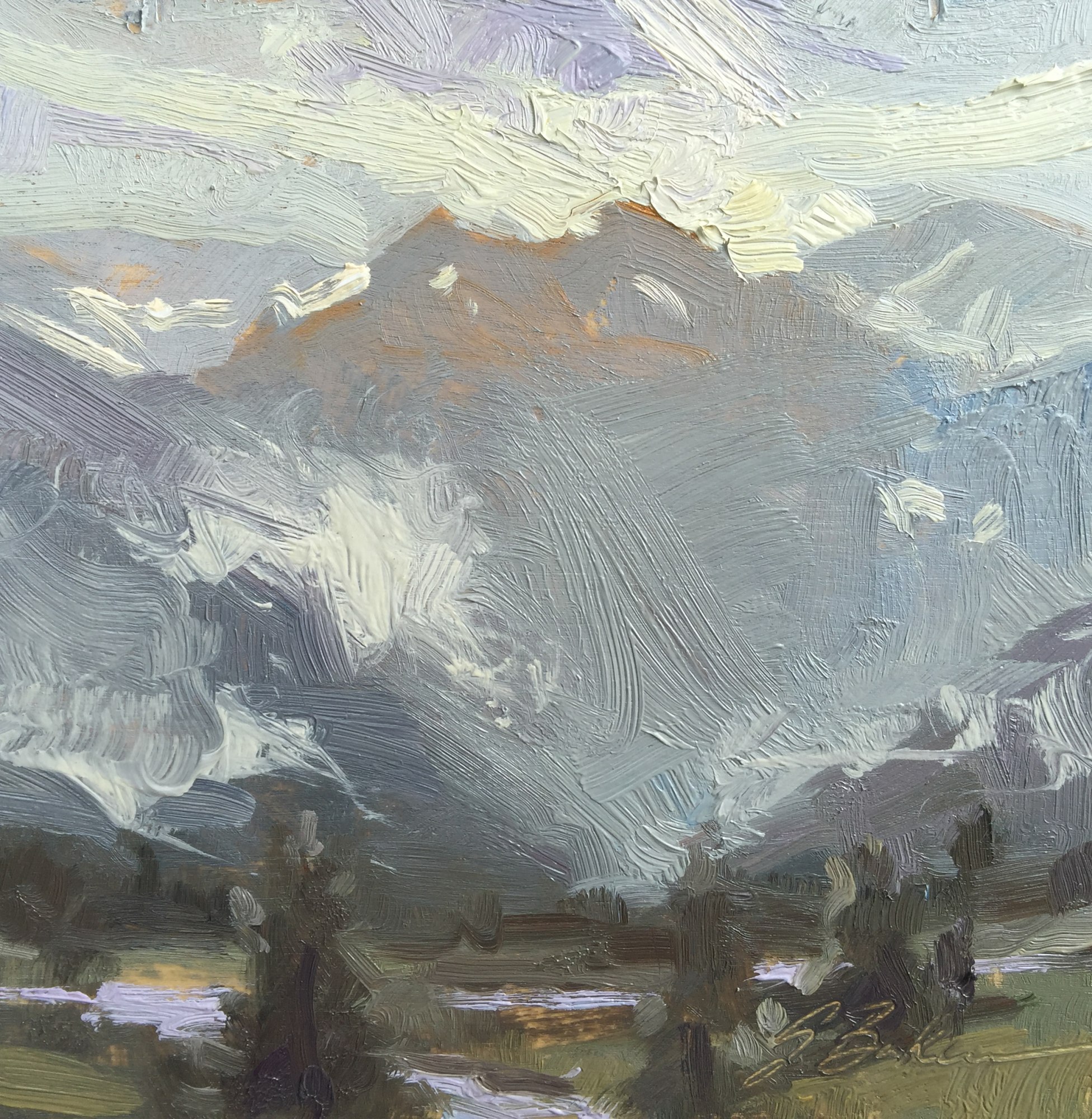 While at the 2016 Telluride Plein Air Festival, I painted little 6x6" quick paintings - or as I like to think of them, KISS - aka, Keep It Simple Stupid, paintings. These oils painted on shellacked birch panels made for fun little segues between larger plein air pieces. They are relaxing to paint, and an added bonus, they disappear like soap bubbles once they are available to sell. I felt a little disappointed The morning I woke up before painting this. A heavy rain had settled in over Telluride. Rain makes for challenging work when Plein Air painting. Then I remembered this view and a vantage point I could simply back my minivan into and stand under the protective shelter of its hatch. In the end, this little guy turned out to be one of my favorite pieces from the week. Ha! Take that Rain.