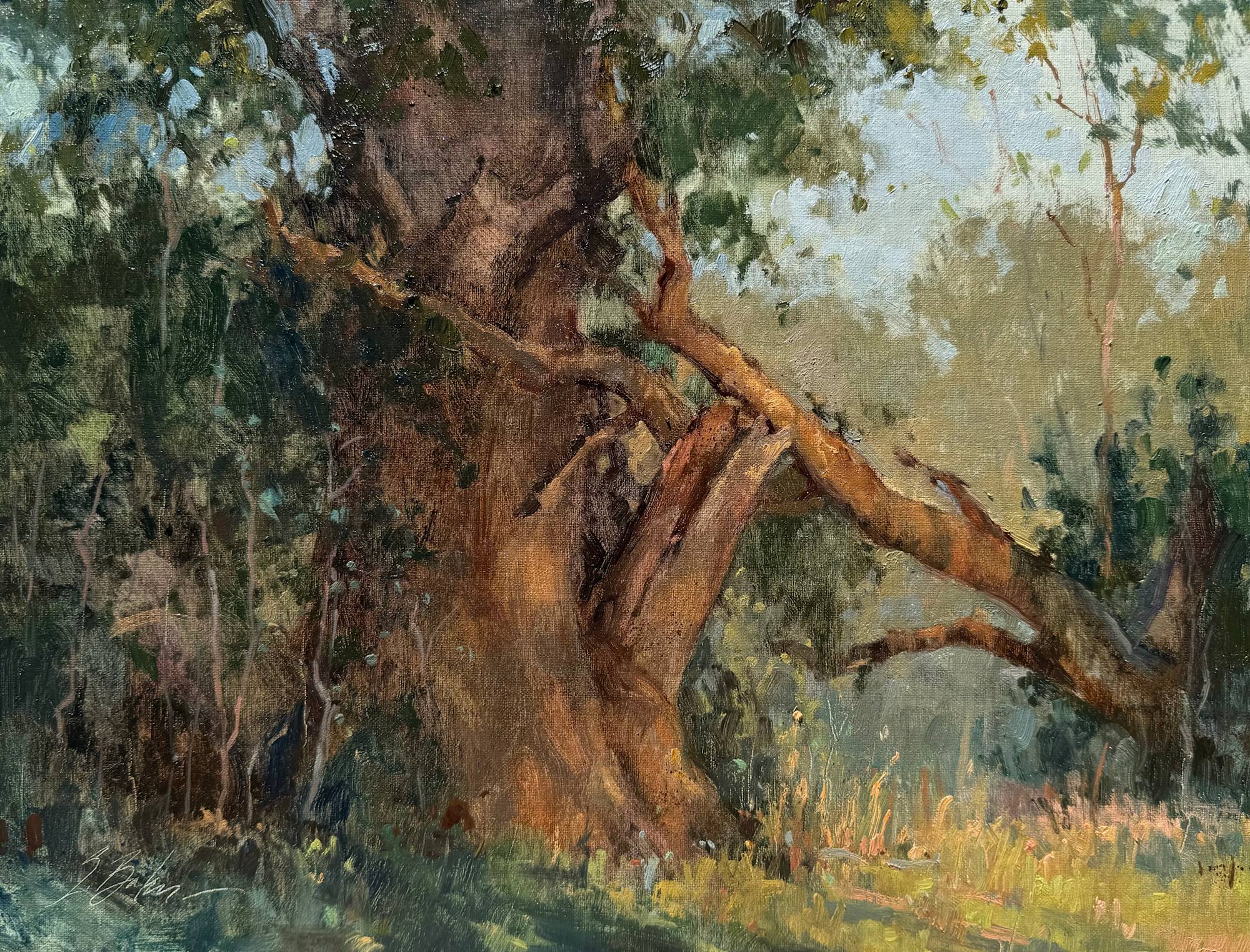 This painting captures a tranquil early morning in a secluded patch of woods, affectionally known to locals as Sherwood Forest. The scene is bathed in soft, dappled light that filters through the trees. Painting here all morning gave me a cloistered feeling, completely immersed in the quietness. The title "Seasons of Life" reflects the progression, the renewal from the decay of the ancient tree.