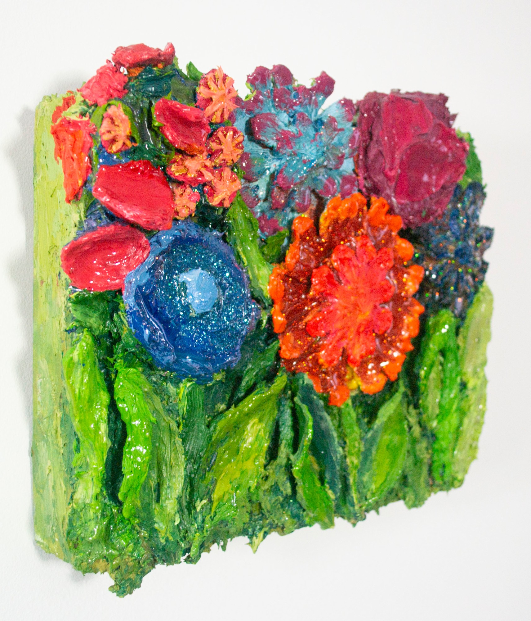 Oil paint, Fabric, glitter, air-dry foam clay, and resin on wood panel