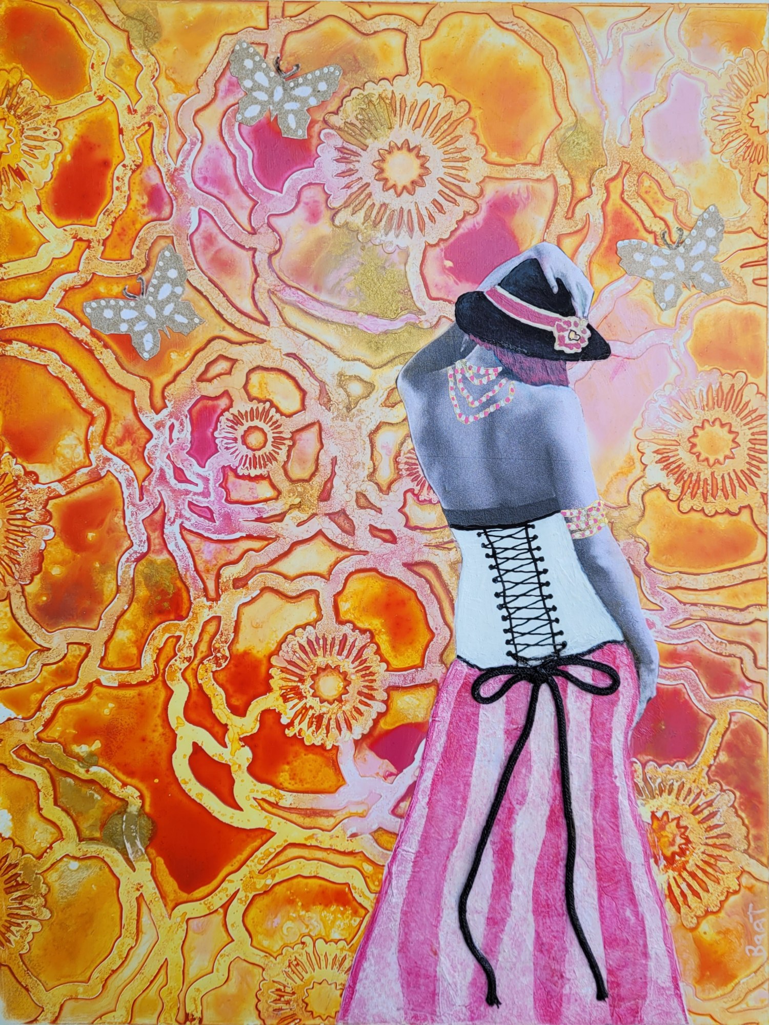 This mixed media piece is created on stone paper and adhered to a prepared wood cradle. All pieces in this series have a white border reminiscent of an old style photo and suggesting the nostalgic feeling of this series.