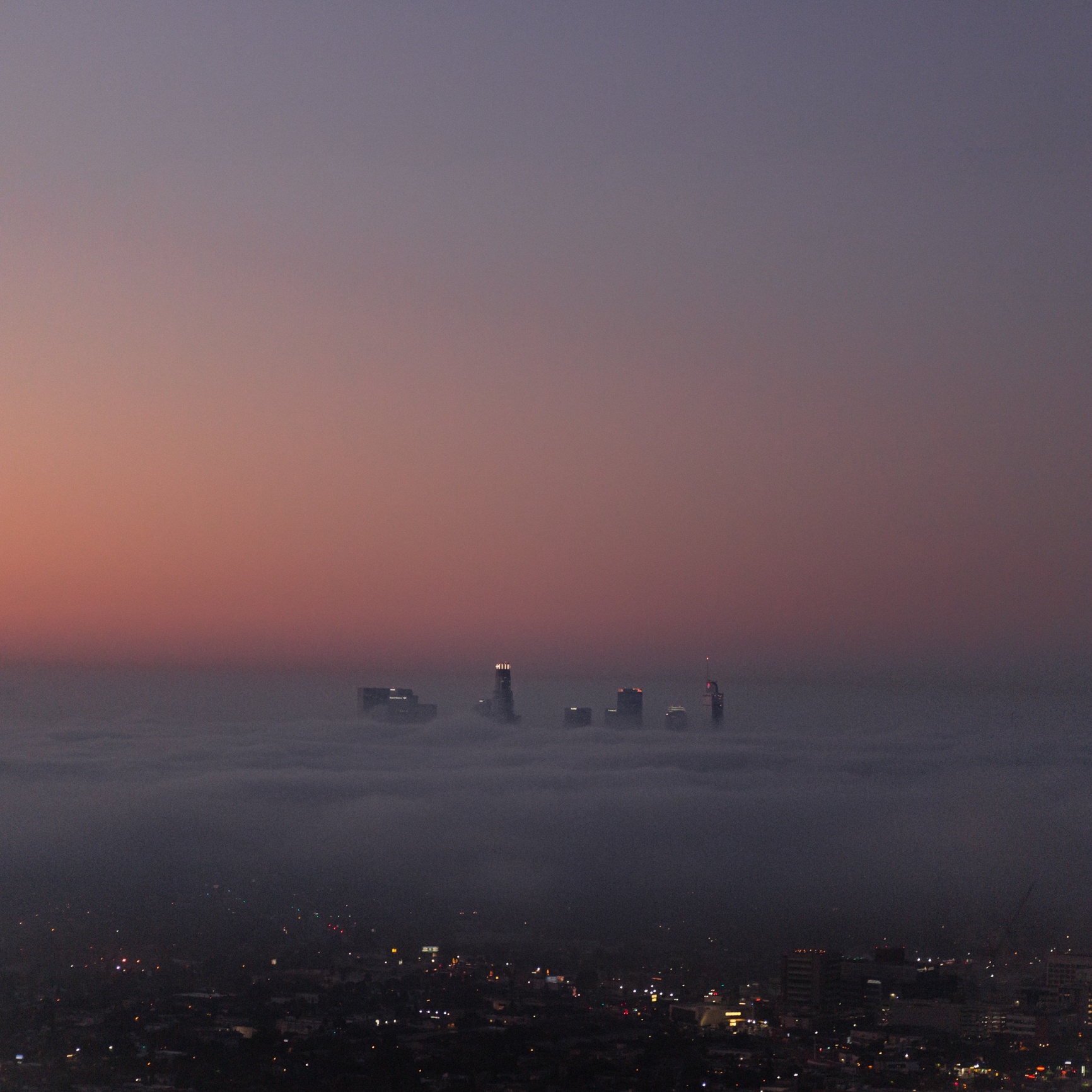 The Los Angeles skyline peeks above purple clouds with the remaining expanse of the city just beneath.