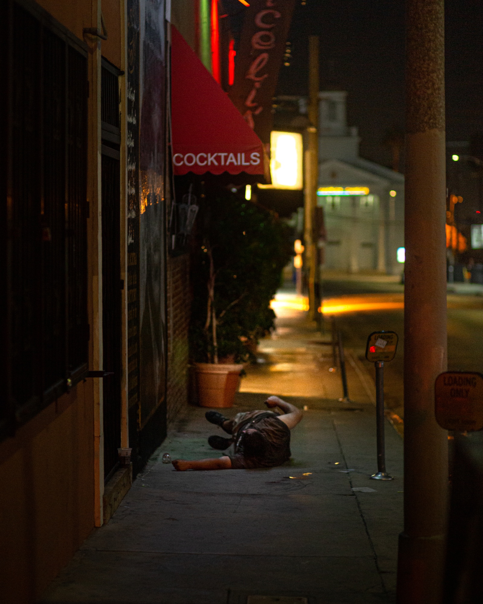 Beneath a bar's awning that proudly proclaims "Cocktails," this unfortunate soul is a stark reminder of the darker side of Hollywood, where the promise of success and indulgence can lead to a desperate and tragic end.