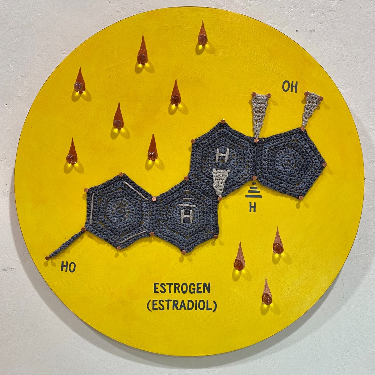 This piece speaks to the ability for individuals to decide where we fall on the gender spectrum, not allowing define us, and breaking the inequalities that these categories force upon us all. The chemical makeup of estrogen is illustrated using crochet, often considered a women’s craft. Glass spheres represent the fragility of eggs. The use of copper is to remind us that everything can be broken down to its chemical elements – and that chemistry is malleable.