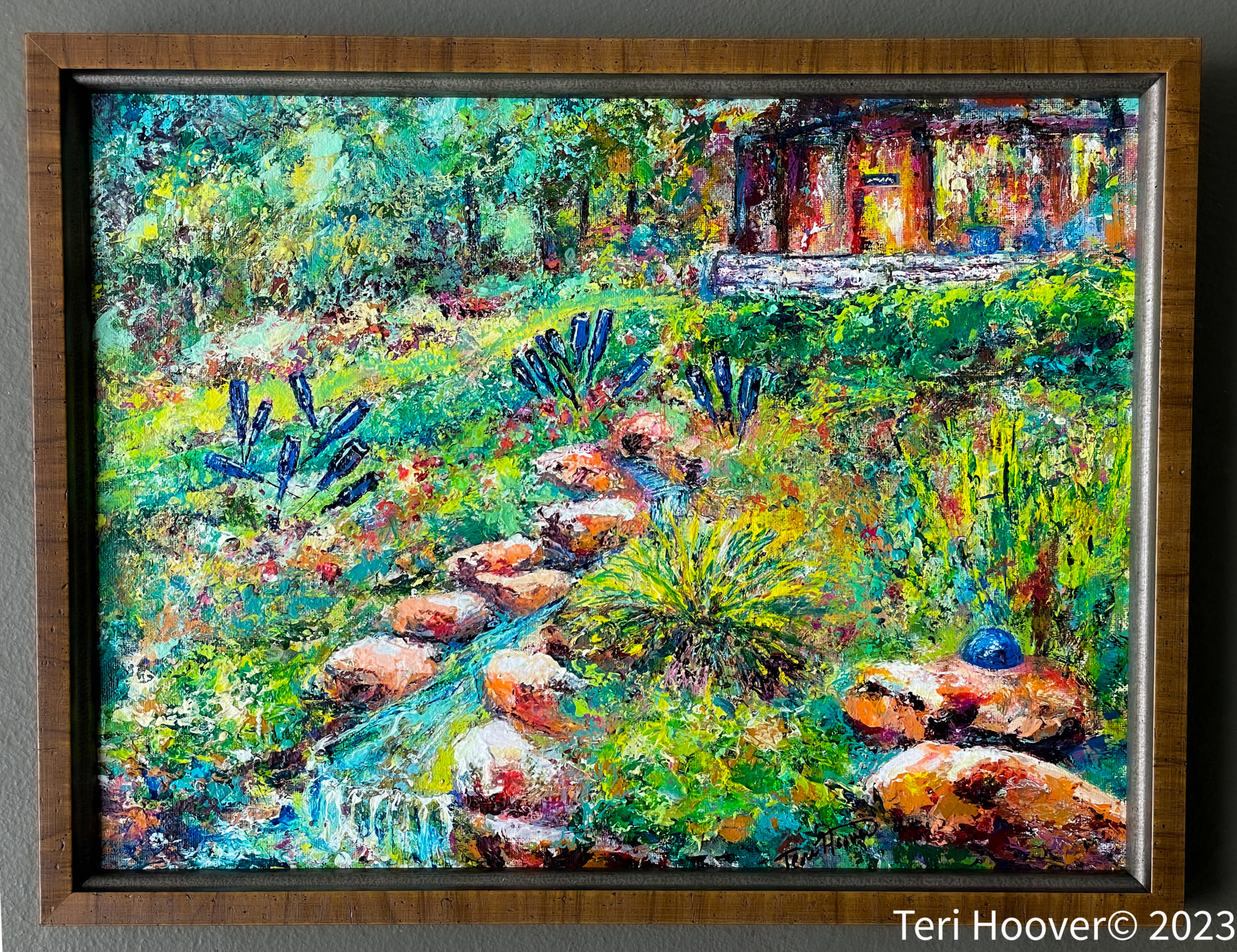The annual New River Valley Garden Tour in the first weekend in July is an event not to be missed. This framed 12” x 16” acrylic painting was inspired by the garden of Paula Golden.