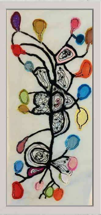 MessageConceptions of Imagination “ invites to contemplate the delicate intersection of reality and creativity. Through embroidery, felt, and beads, this piece symbolizes the ways imagination shapes my understanding of the process of creativity. Each stitch represents a moment of thought, weaving together personal narratives and collective experiences.. Embroidery, Felt, beads