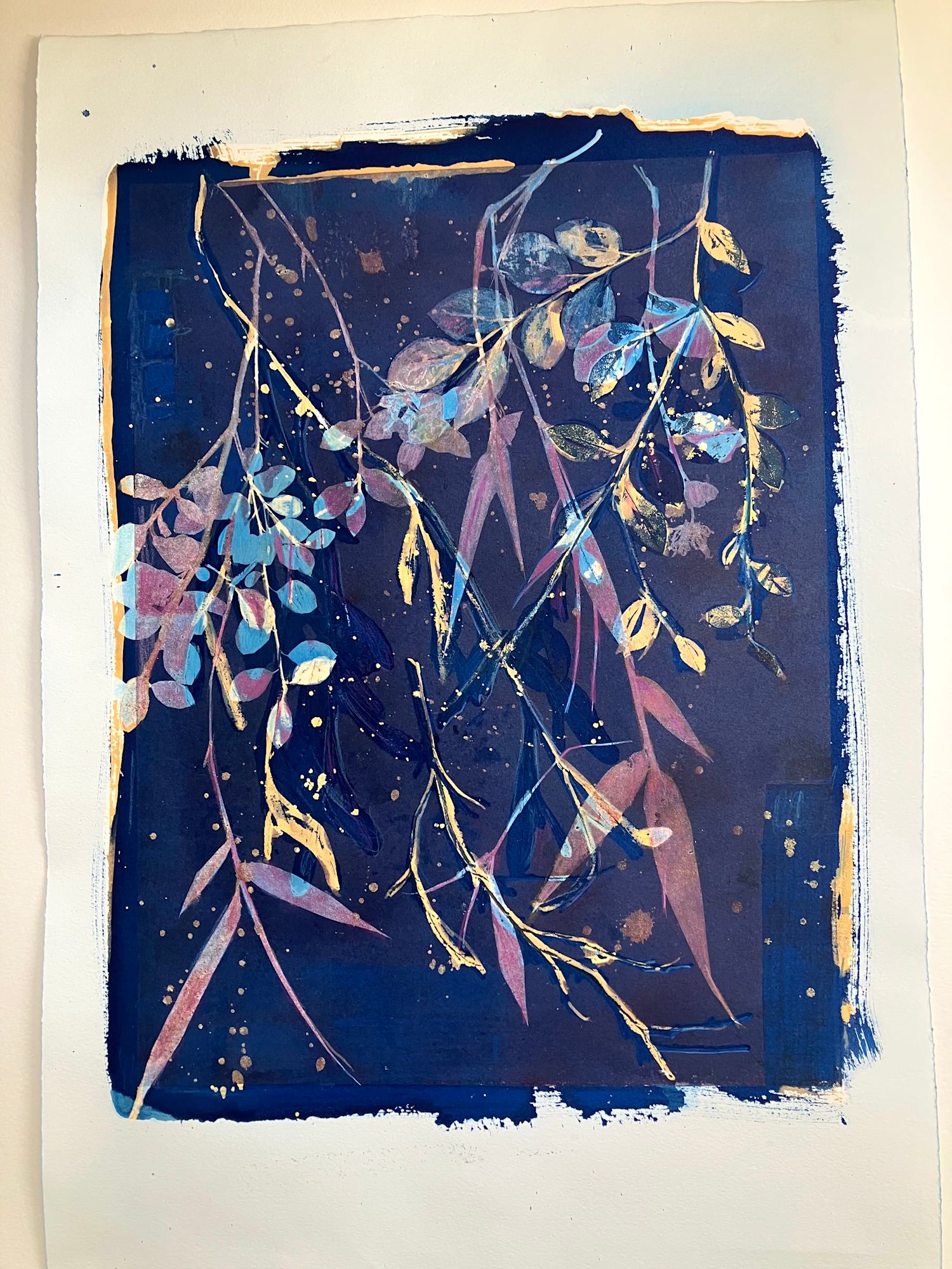 MessageCyanotype emulsion is painted atop a mono print of a variety of leaves. A mixture of soda ash acts a bleach removing certain areas of the cyanotype allowing images, texture and color of the mono print to be seen. Watercolor is then painted in certain areas to add color and to enhance the image.