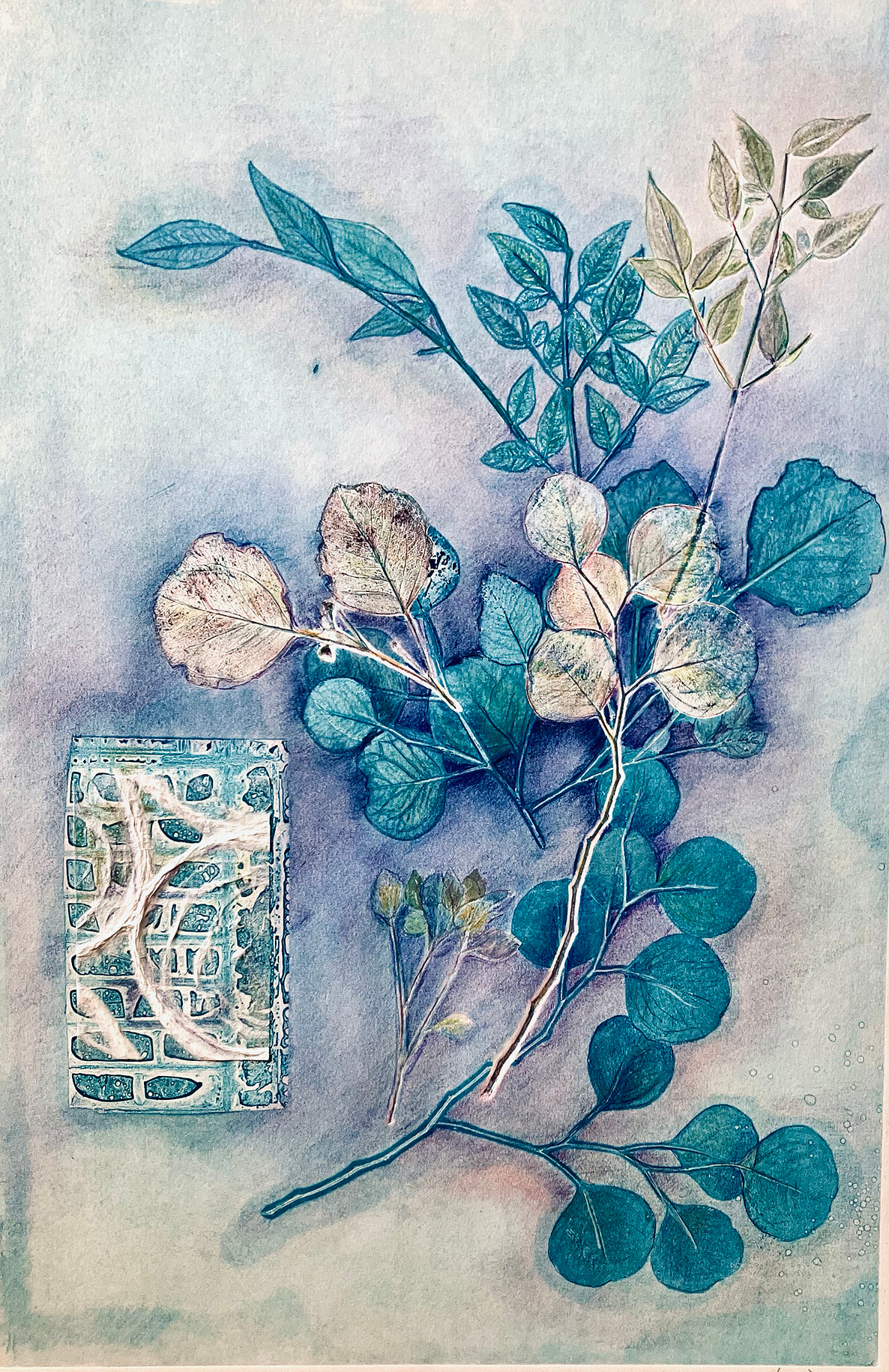 MessageA "ghost" is the second print created when an additional paper is placed on the same plate and run through the press again. Various leaves placed on a plate painted turquoise, next to a piece of plastic. The plate then went through the press. The print was then embellished with collage and color pencil.