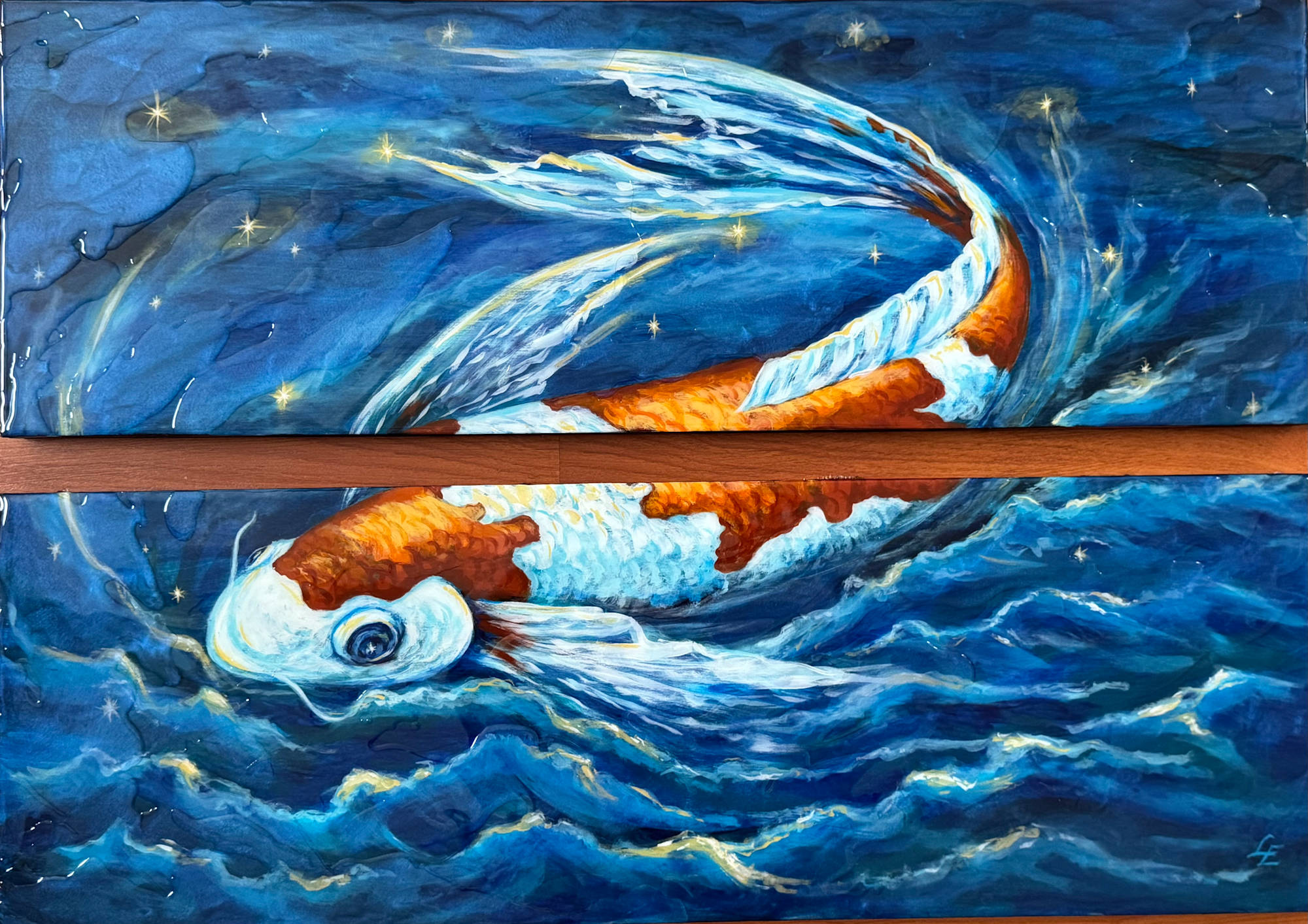 MessageA diptych of of a vivid orange and white koi, swimming through heavenly waters surrounded by glowing stars. Painted in acrylics, with layered resin and mica powder on two 12 x 36 panels. Total size is 24 x 36.