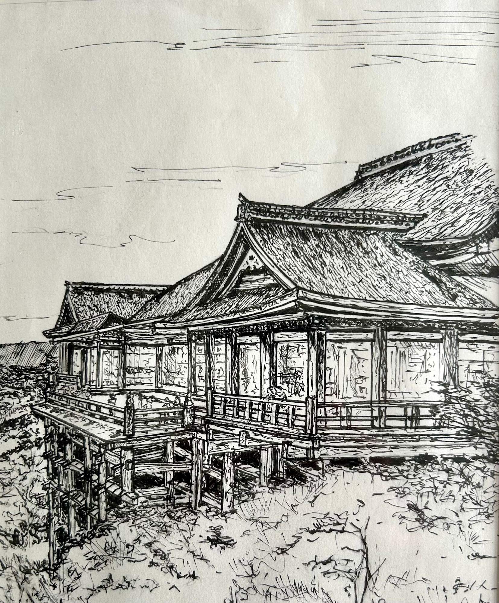 MessageKiyomizu-dera, in the hills above Kyoto, takes its name from the Otowa Waterfall and the pureness of its waters. The building in the drawing is the Okuno-in Hall, and was rebuilt in 1633.