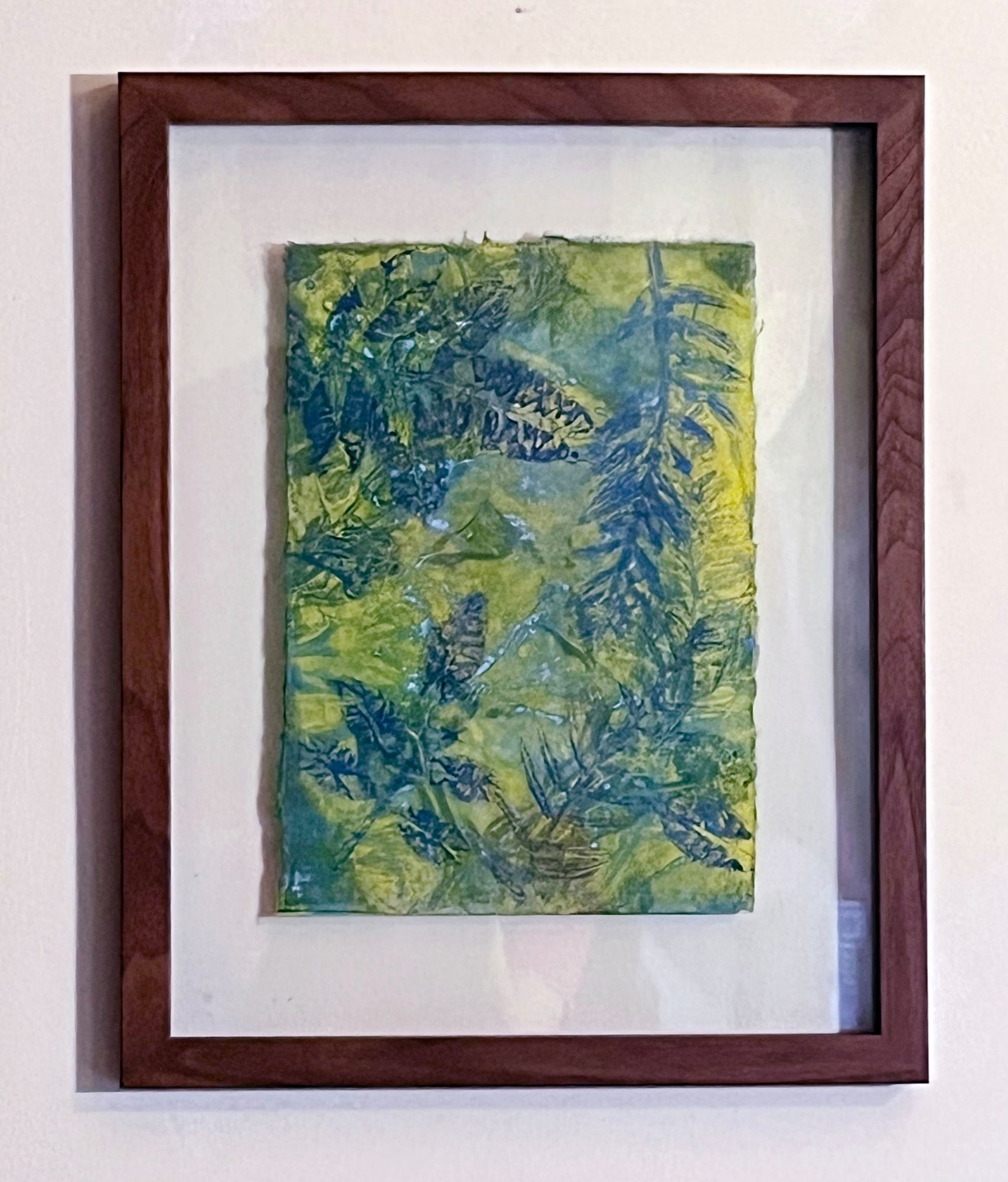MessageOne of a kind monotype on Japanese paper made with a gelatin plate and leaves from my yard.