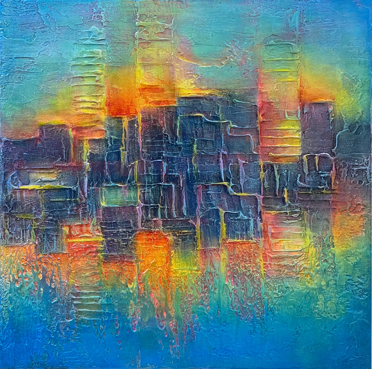 MessageThe composition evokes an urban environment with city lights' reflections on the sky, the buildings and the water.
