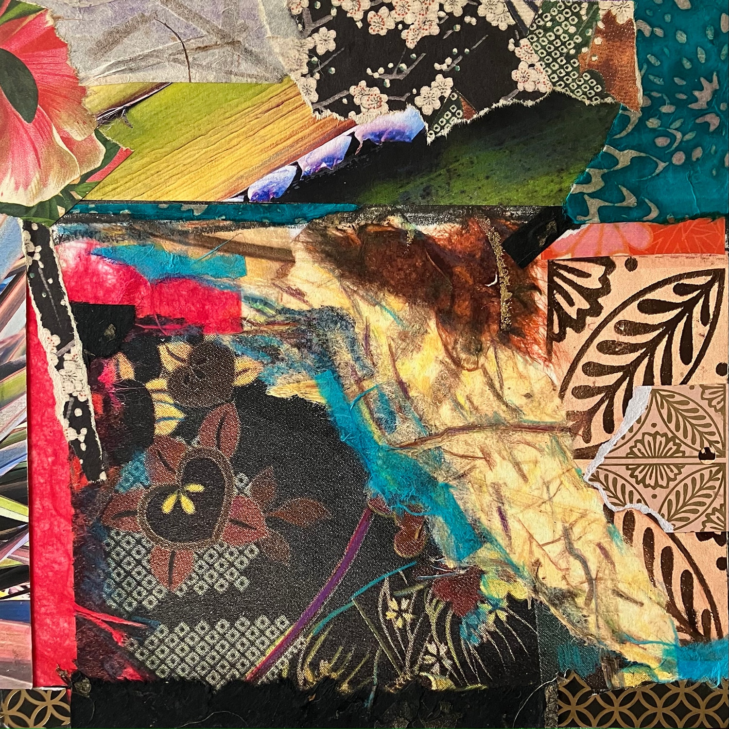 MessageCollage rice papers and gift wrap papers in random designs on wood panel