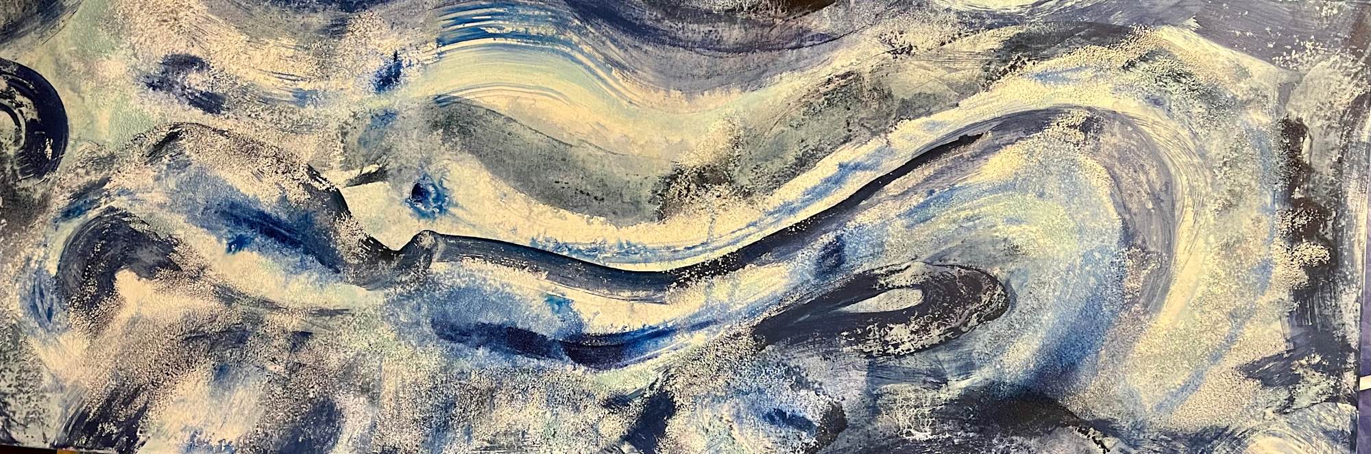 MessageCrafted with acrylic and mixed texture mediums, it features a swirling array of patterns defined by dynamic brushstrokes. The piece employs a rich palette of blues, from deep navy to light sky blue, accented with white, creating a vivid interplay of colors. This composition exudes both energy and tranquility, capturing the essence of flowing water and drifting clouds. Its fluid movement conveys the untethered grace and strength of a dragon uniting and embracing sky and sea in its joyous, powerful dance. The artwork speaks of the energy and power released through freedom and motion.