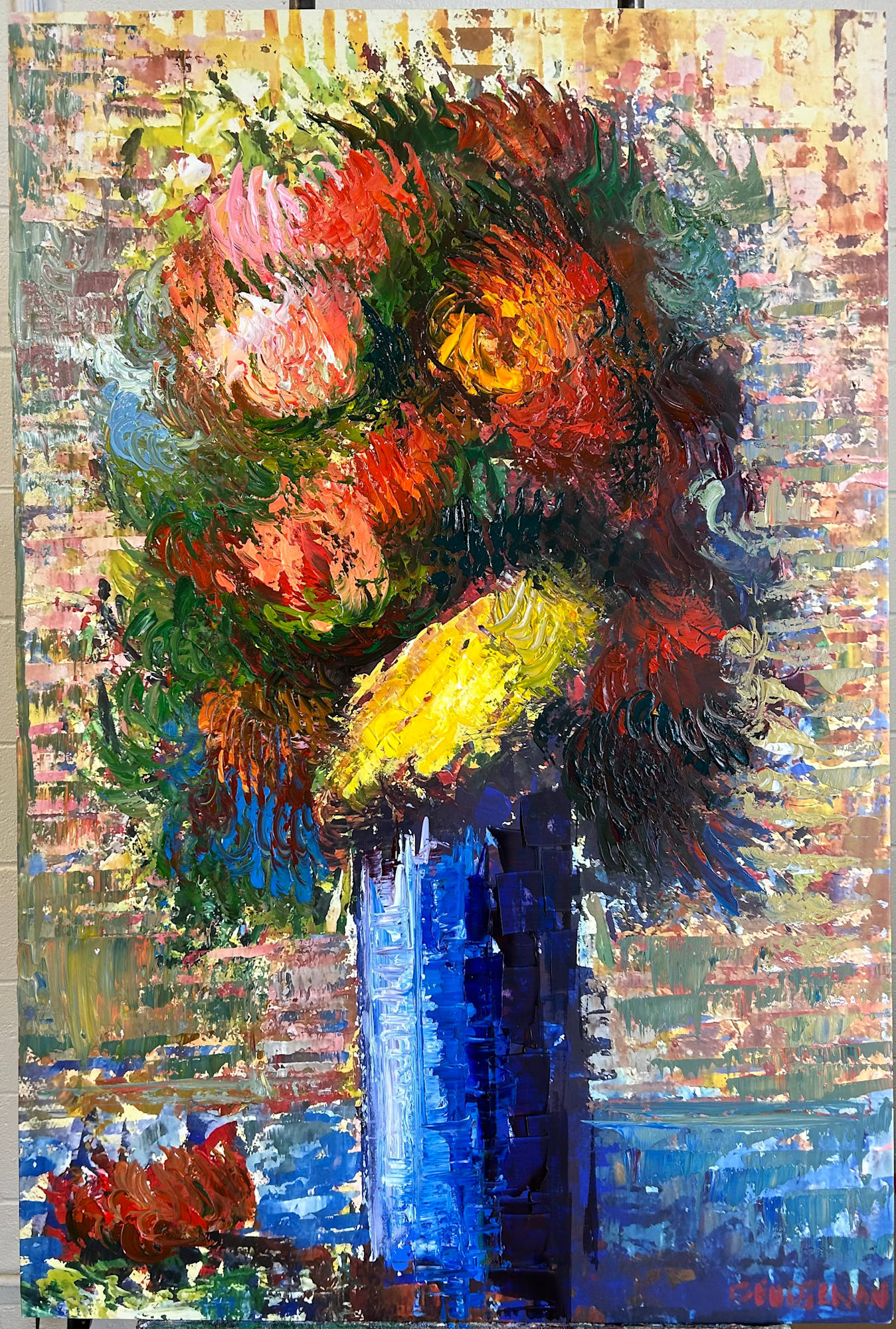 MessageImpressionistic painting dealing with the subject of floral still life with a blue vase with initially started as a digital print