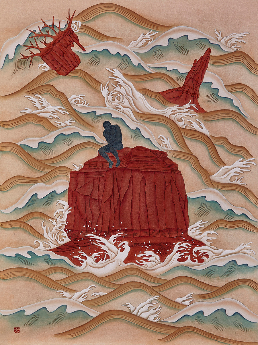 Message'Turbulence' is composed with rock formations in Monument Valley and waves. We, as the thinker on the rock, continue to face challenges in life, and our emotion runs through calm and roaring waves in every aspect of life.