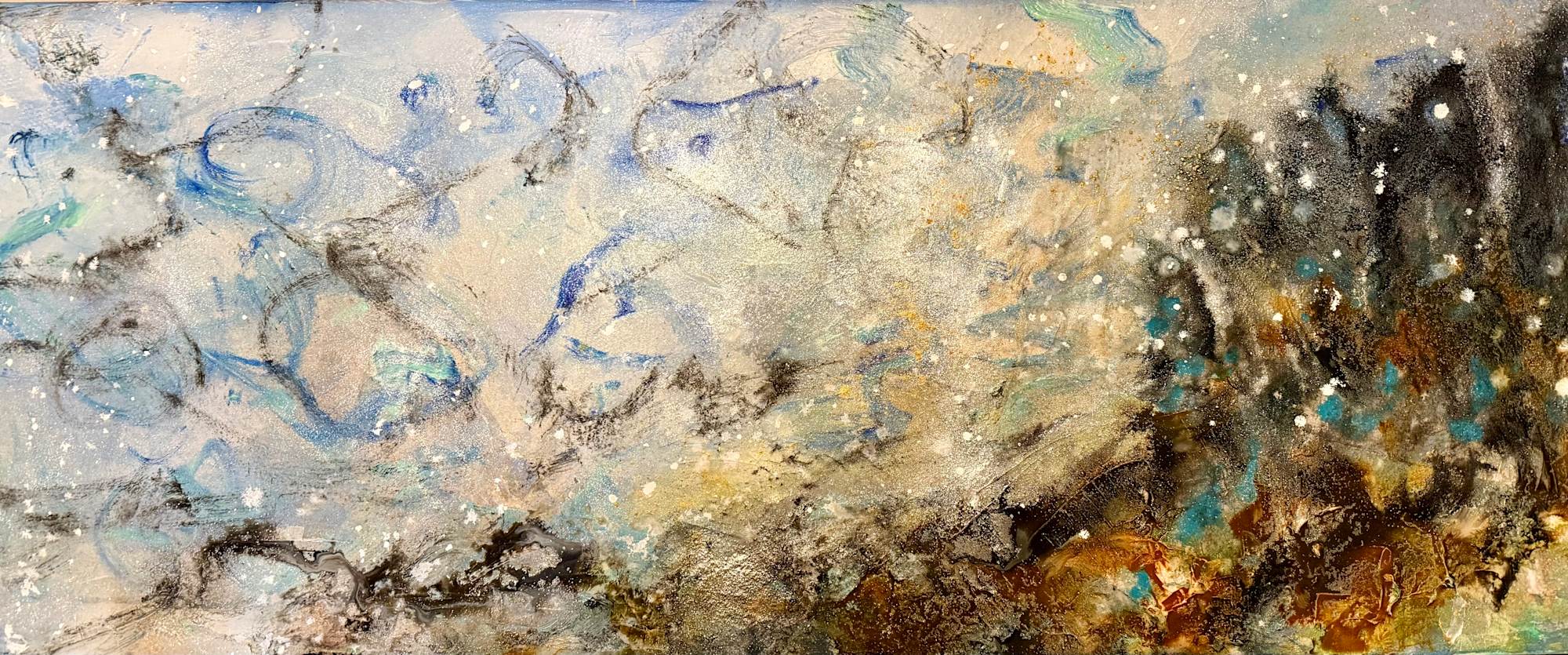 Textures flicker with fire and frost. Glyph-like marks drift across the surface like messages carried by the wind. Snow-like specks fall softly, like stars or blessings, while earth tones and shimmering blue suggest the unseen pulse of the land beneath our feet.