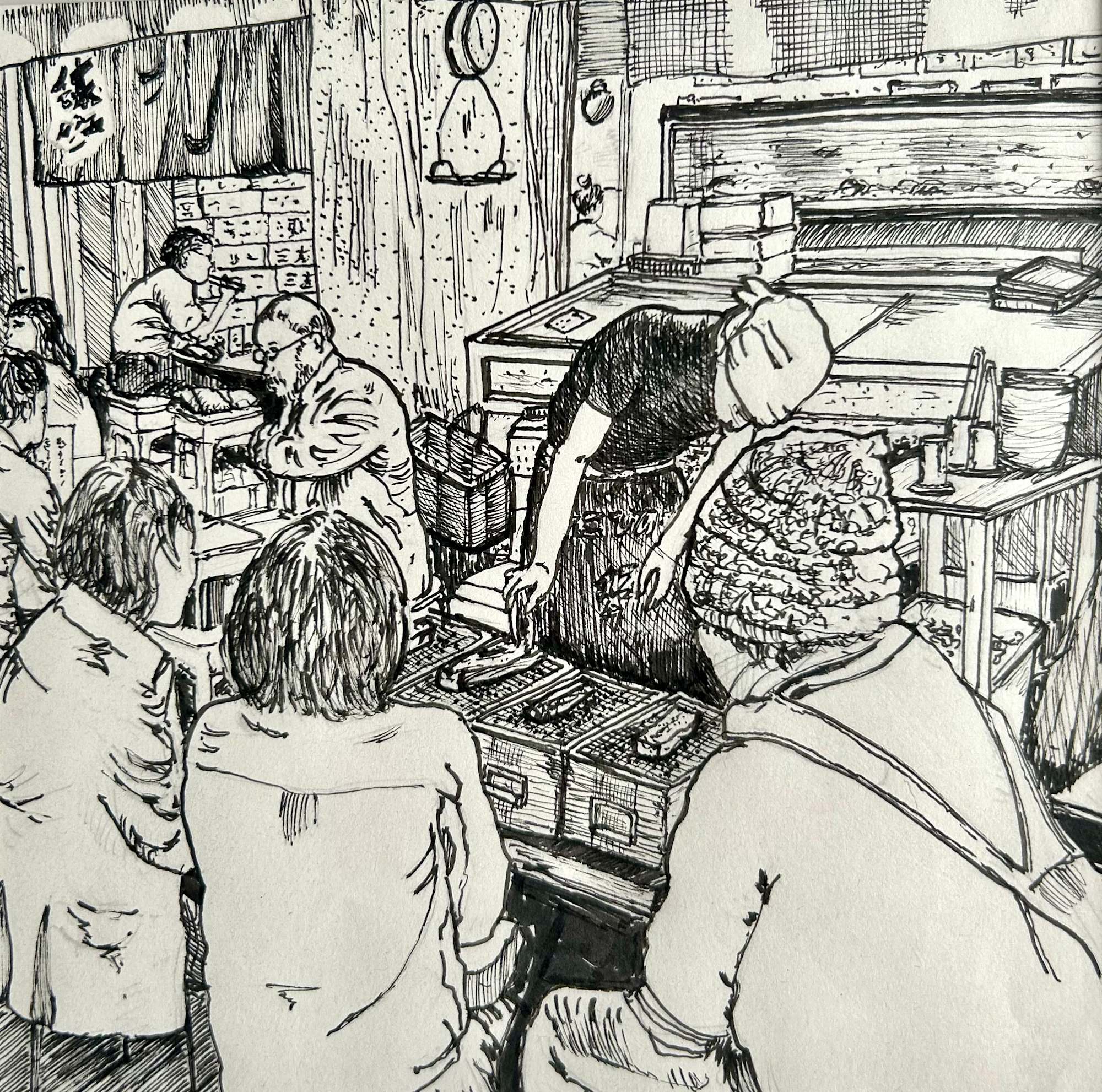 MessageA yokocho is a narrow alleyway in Japan, with many tiny restaurants and bars. This scene is in an area of Tokyo called Akabane. Diners are enjoying seafood grilled on an outdoor hibachi.