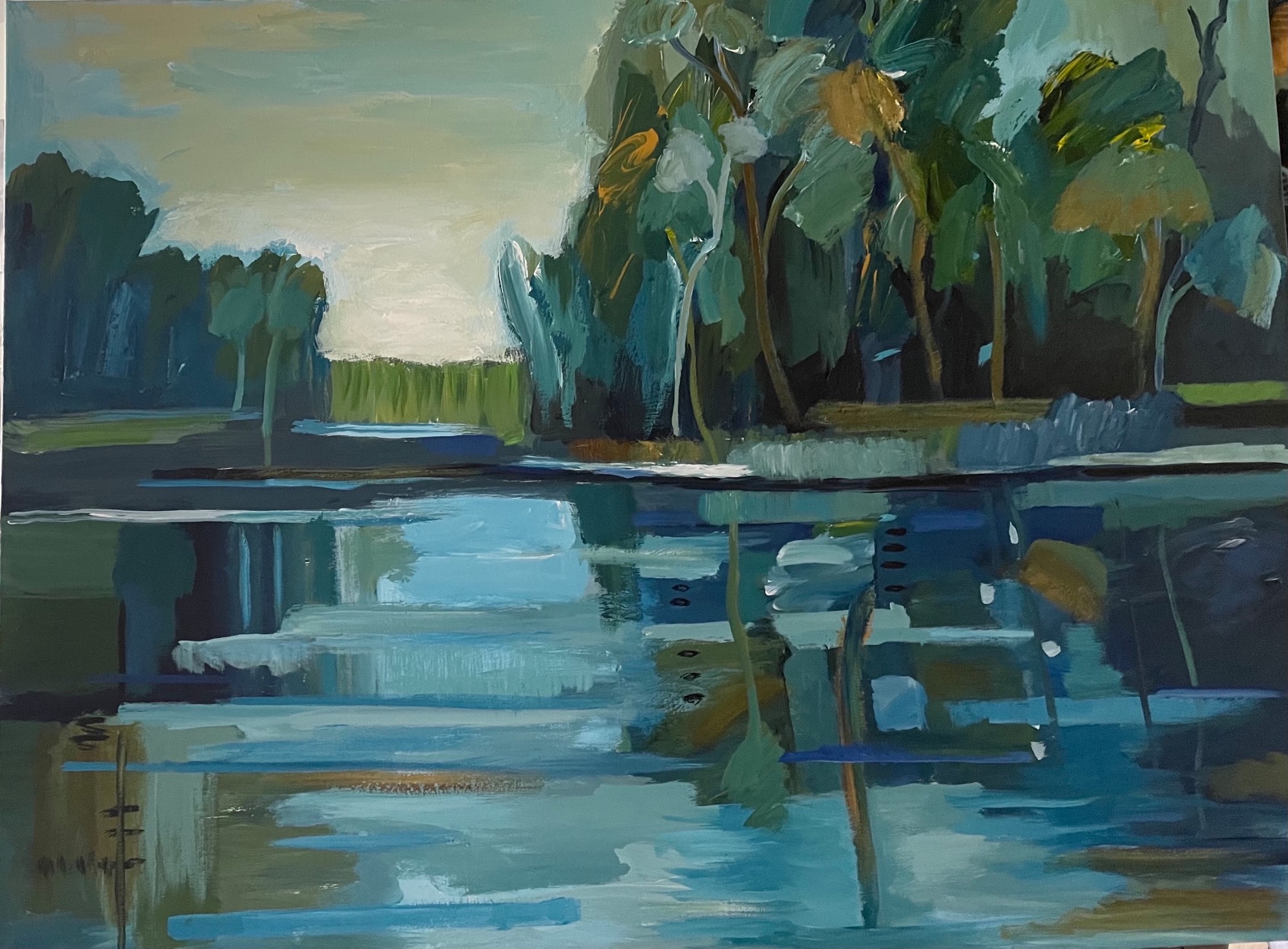 Calming painting of Lake, Trees and their reflection on the water. Limited palette with blue shades, strong brush strokes, creating textures.