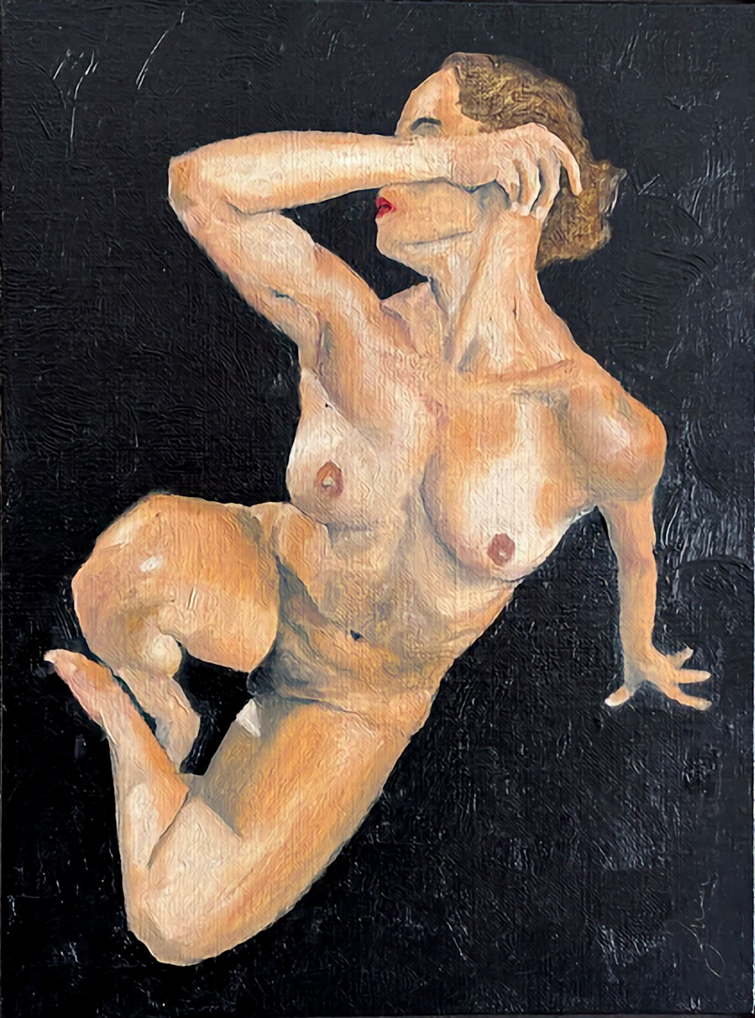 Nude on floor-right arm across face-black bg
