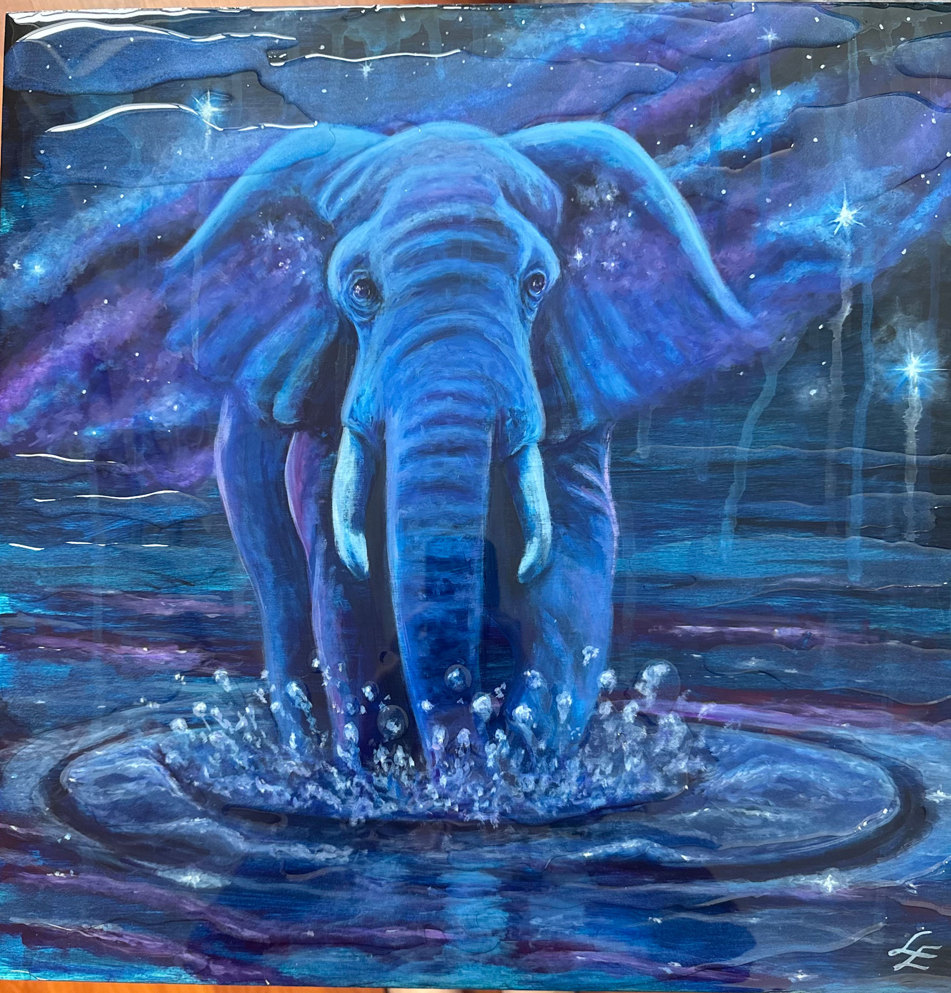 Painted in acrylic and oil, a mystical elephant matriarch manifests from the cosmos. Nebulae spread across the night sky behind her, while individuals stars drip to read the reflective waters through which she paces. Textured resin has been built up in layers, some tinted with blue mica powder.