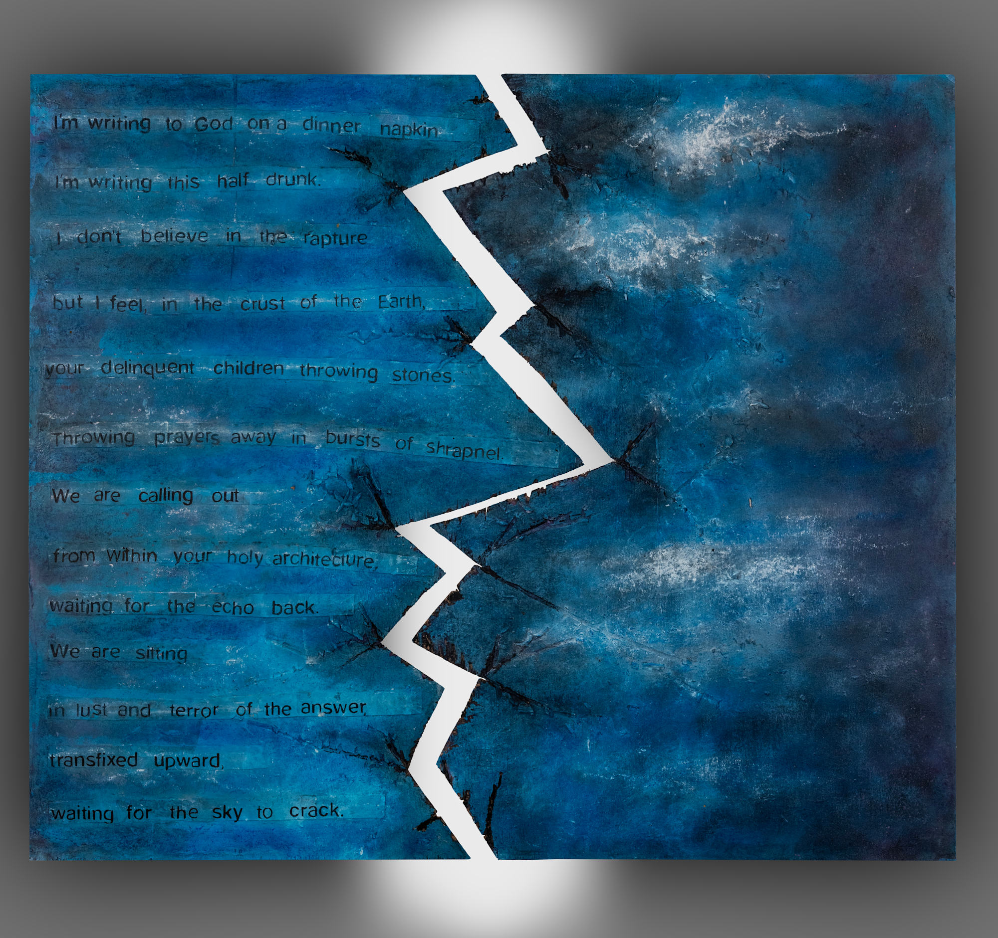 - Acrylic, charcoal, spray paint, small lights, markers on wood panels