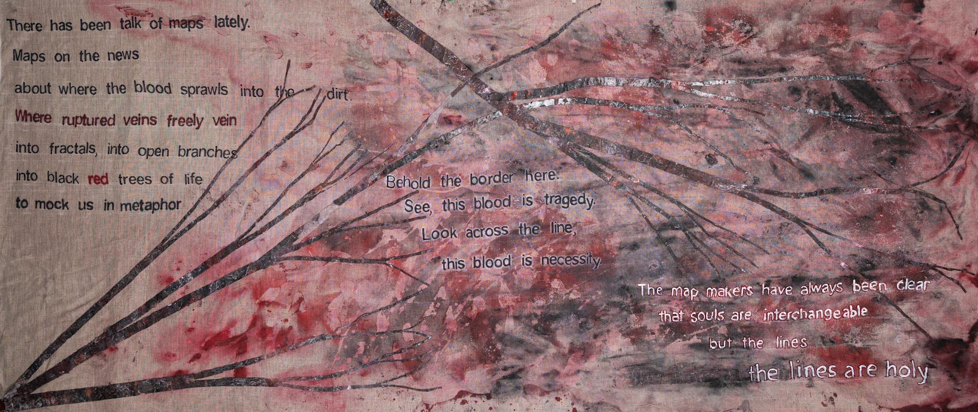 - Acrylic, inks, plastic strips, markers on raw linen