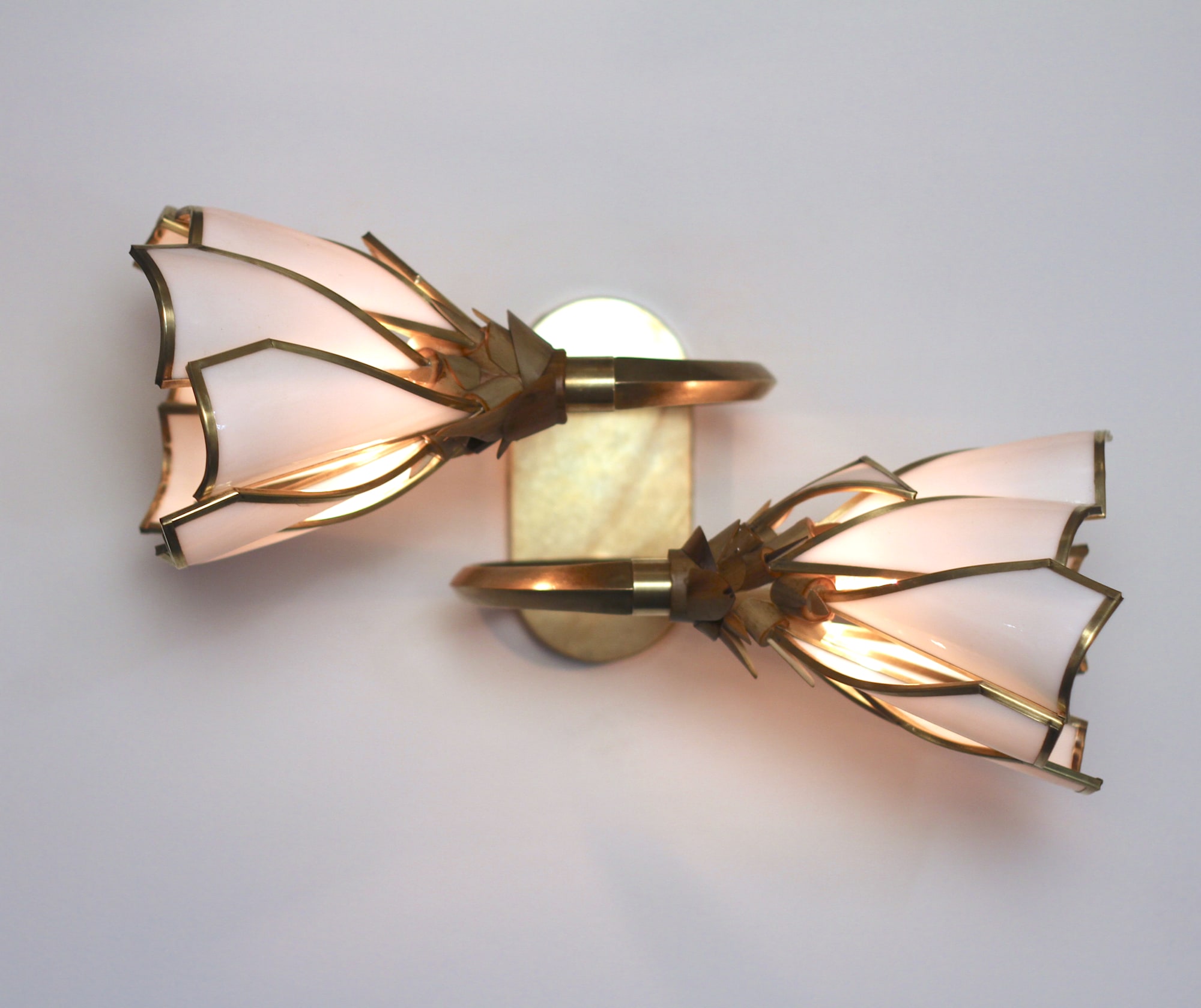 Opaque white glass blooming from brass fixtures. Custom LED Bulbs with DC 3v power. Optional wiring for 120V and use with standard E12 Candelabra light Bulbs.