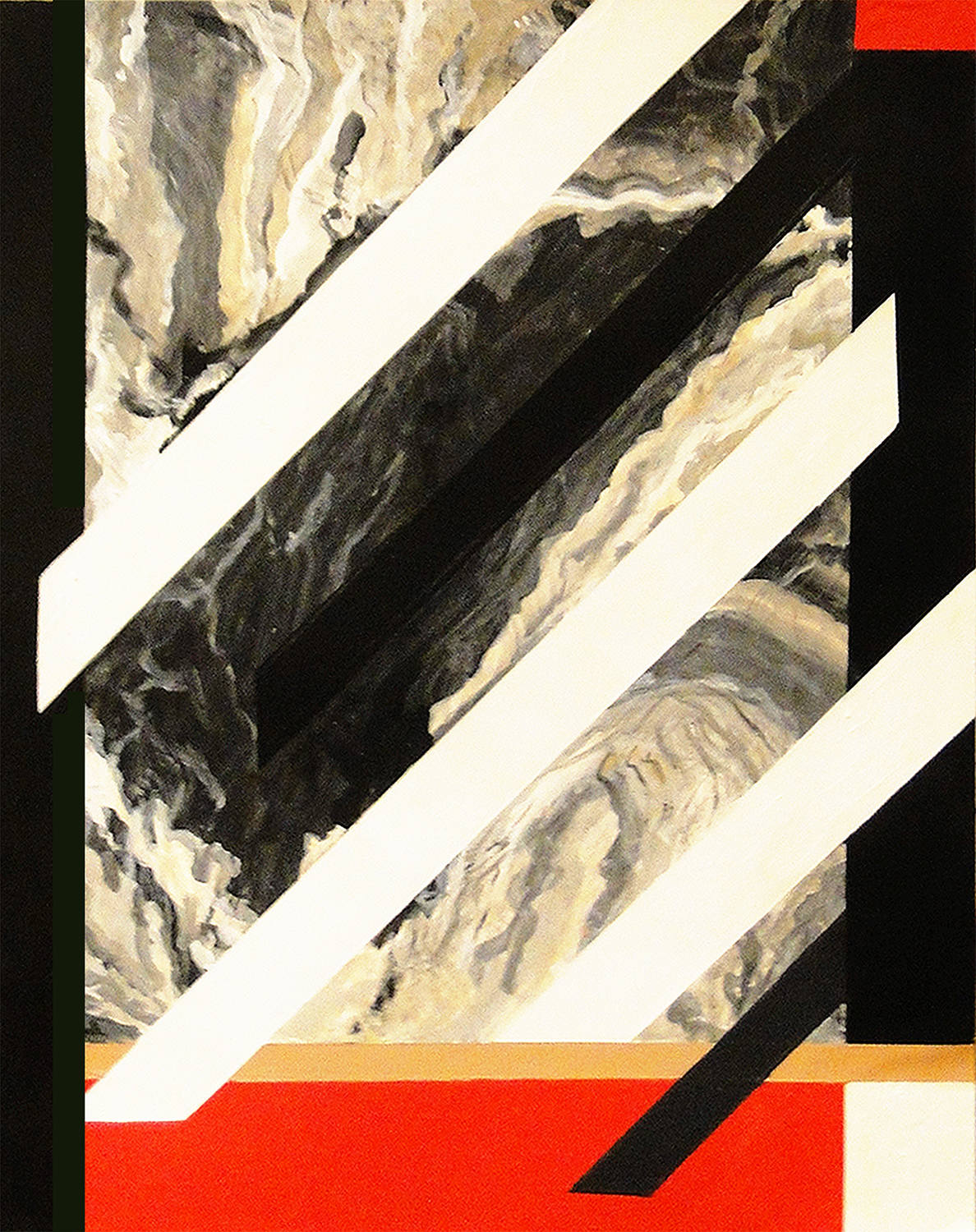 A San Francisco Bay reflection rendered in black and white, with vertical, horizontal black and red, diagonal stripes intersecting the painting in black, while, and grey.